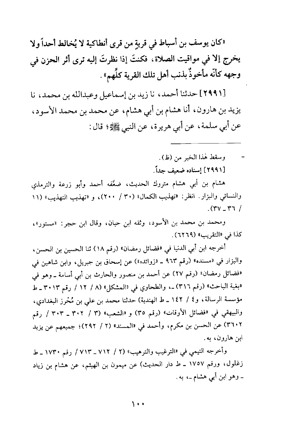 2991 - حَدَّثَنَا أَحْمَدُ، نا زَيْدُ بْنُ إِسْمَاعِيلَ وَعَبْدُ اللهِ بْنُ مُحَمَّدٍ، نا يَزِيدُ بْنُ هَارُونَ، أنا هِشَامُ بْنُ أَبِي هِشَامٍ، عَنْ مُحَمَّدِ بن محمد الأَسْوَدِ، عَنْ أَبِي سَلَمَةَ، عَنْ أَبِي هُرَيْرَةَ، عَنِ النَّبِيِّ صَلَّى اللَّهُ عَلَيْهِ وَسَلَّمَ؛ قَالَ -[101]-: «أُعْطِيَتْ أُمَّتِي خَمْسَ خِصَالٍ فِي رَمَضَانَ لَمْ تُعْطَهُ أُمَّةٌ قَبْلَهُمْ: خُلُوفُ فَمِ الصَّائِمِ أَطْيَبُ عِنْدَ اللهِ مِنْ رِيحِ الْمِسْكِ، وَتَسْتَغْفِرُ لَهُمُ الْمَلائِكَةُ حَتَّى يُفْطِرُوا، وَتُصَفَّدُ فِيهِ مَرَدَةُ الشَّيَاطِينِ؛ فَلا يَخْلُصُونَ إِلَى مَا كَانُوا يَخْلُصُونَ فِيهِ إِلَى غَيْرِهِ، وَيُزَيِّنُ اللهُ عَزَّ وَجَلَّ فِيهِ فِي كُلِّ يَوْمٍ جَنَّتَهُ، ثُمَّ يَقُولُ: يُوشِكُ عِبَادِيَ الصَّالِحُونَ أَنْ يُلْقُوا عَنْهُمُ الْمُؤْنَةَ وَالأَذَى، وَأَنْ يَصِيرُوا إِلَيَّ، وَيُغْفَرُ لَهُمْ فِي آخِرِ لَيْلَةٍ» . قِيلَ: يَا رَسُولَ اللهِ! هِيَ لَيْلَةُ الْقَدْرِ؟ قَالَ: «لا، وَلَكِنْ إِنَّمَا يُوَفَّى الْعَامِلُ أَجْرَهُ إِذَا قَضَى عَمَلَهُ»