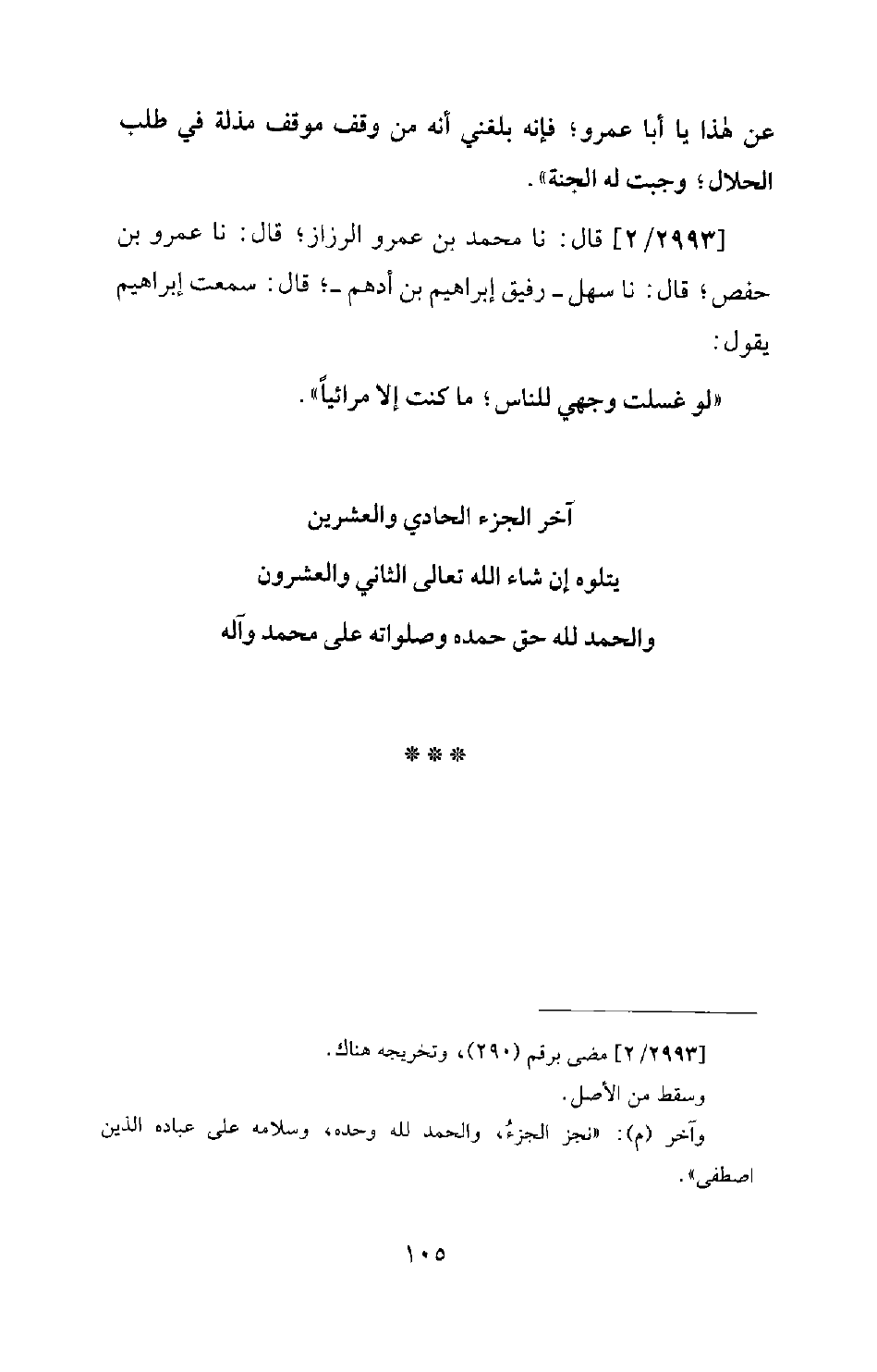 2993 - / 2 م - قَالَ: نا مُحَمَّدُ بْنُ عَمْرٍو الرَّزَّازُ؛ قَالَ: نا عَمْرُو بْنُ حَفْصٍ؛ قَالَ: نا سَهْلٌ - رَفِيقُ إِبْرَاهِيمَ بْنِ أَدْهَمَ -؛ قَالَ: سَمِعْتُ إِبْرَاهِيمَ يَقُولَ: لَوْ غَسَلْتُ وَجْهِي لِلنَّاسِ؛ مَا كُنْتُ إِلا مُرَائِيًا.