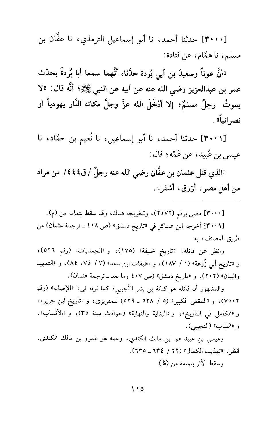 3001 - حَدَّثَنَا أَحْمَدُ، نا أَبُو إِسْمَاعيِلَ، نا نُعَيْمُ بْنُ حَمَّادٍ، نا عِيسَى بْنُ عُبَيْدٍ، عَنْ عَمِّهِ، قَالَ: الَّذِي قَتَلَ عُثْمَانَ بْنَ عَفَّانَ رَضِيَ اللهُ عَنْهُ رَجُلٌ مِنْ مُرَادَ مِنْ أَهْلِ مِصْرَ، أَزْرَقُ، أَشْقَرُ.