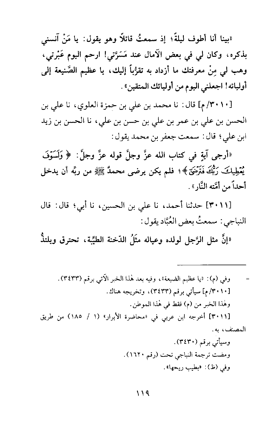 3010 - / م - قَالَ: نا مُحَمَّدُ بْنُ عَلِيِّ بْنِ حَمْزَةَ الْعَلَوِيُّ، نا عَلِيُّ بْنُ الْحَسَنِ بْنِ عَلِيِّ بْنِ عُمَرَ بْنِ عَلِيِّ بن حسن بْنِ عَلِيٍّ، نا الْحَسَنُ بْنُ زَيْدِ بْنِ عَلِيٍّ؛ قَالَ: سَمِعْتُ جَعْفَرَ بْنَ مُحَمَّدٍ يَقُولُ: أَرْجَى آيَةٍ فِي كِتَابِ اللهِ عَزَّ وَجَلَّ قَوْلُهُ عَزَّ وَجَلَّ: (وَلَسَوْفَ يُعْطِيكَ رَبُّكَ فَتَرْضِى (5)) ؛ فَلَمْ يَكُنْ يَرْضَى مُحَمَّدٌ صَلَّى اللَّهُ عَلَيْهِ وَسَلَّمَ مِنْ رَبِّهِ أَنْ يُدْخِلَ أَحَدًا مِنْ أُمَّتِهِ النَّارَ.