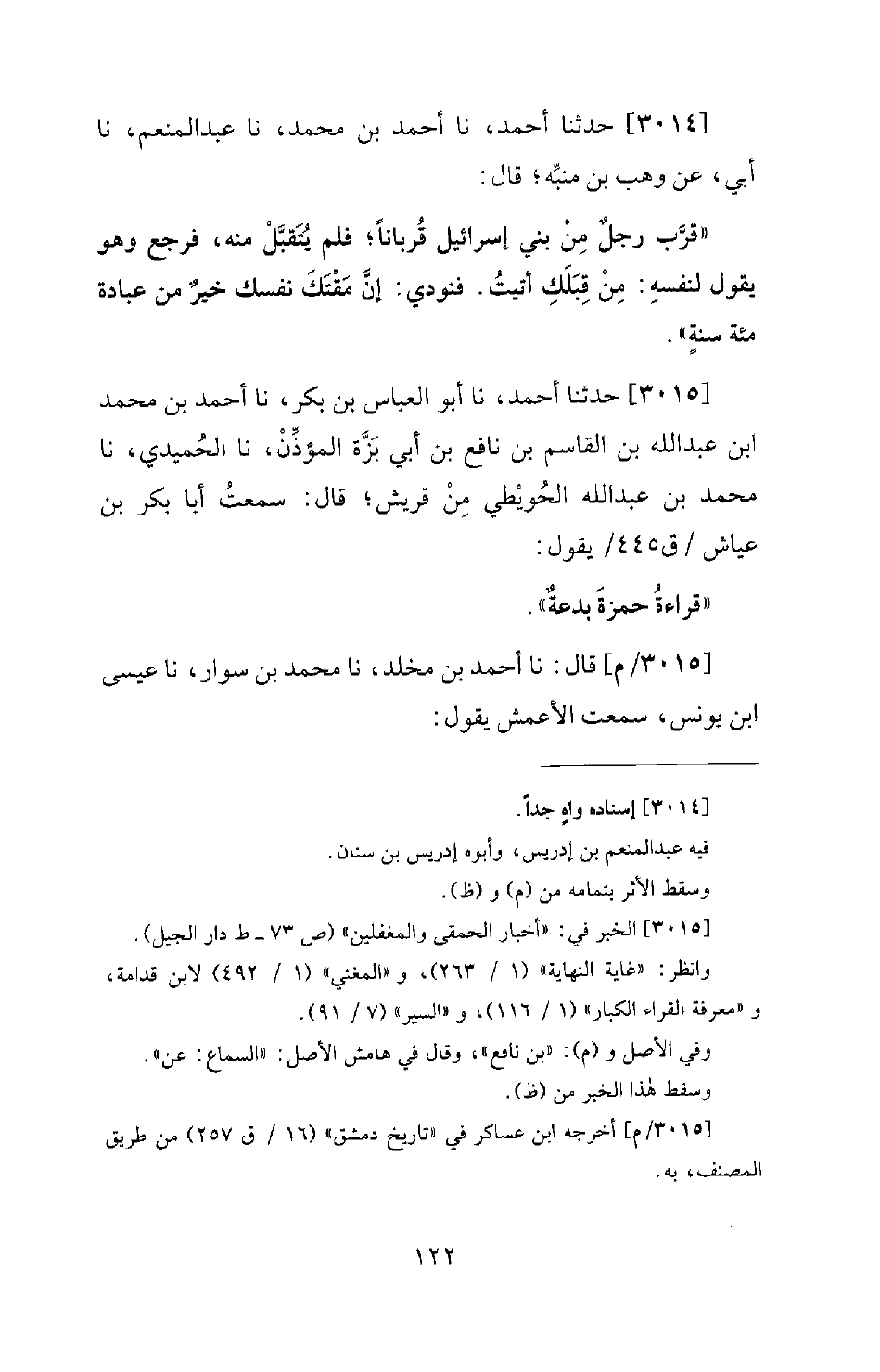 3015 - حَدَّثَنَا أَحْمَدُ، نا أَبُو الْعَبَّاسِ بْنُ بَكْرٍ، نا أَحْمَدُ بْنُ مُحَمَّدِ بْنِ عَبْدِ اللهِ بْنِ الْقَاسِمِ بْنِ نَافِعِ بْنِ أَبِي بَزَّةَ الْمُؤَذِّنُ، نا الْحُمَيْدِيُّ، نا مُحَمَّدُ بْنُ عَبْدِ اللهِ الْحُوَيْطِيُّ مِنْ قُرَيْشٍ؛ قَالَ: سَمِعْتُ أَبَا بَكْرِ بْنَ عَيَّاشٍ يَقُولُ: قِرَاءَةُ حَمْزَةَ بِدْعَةٌ.