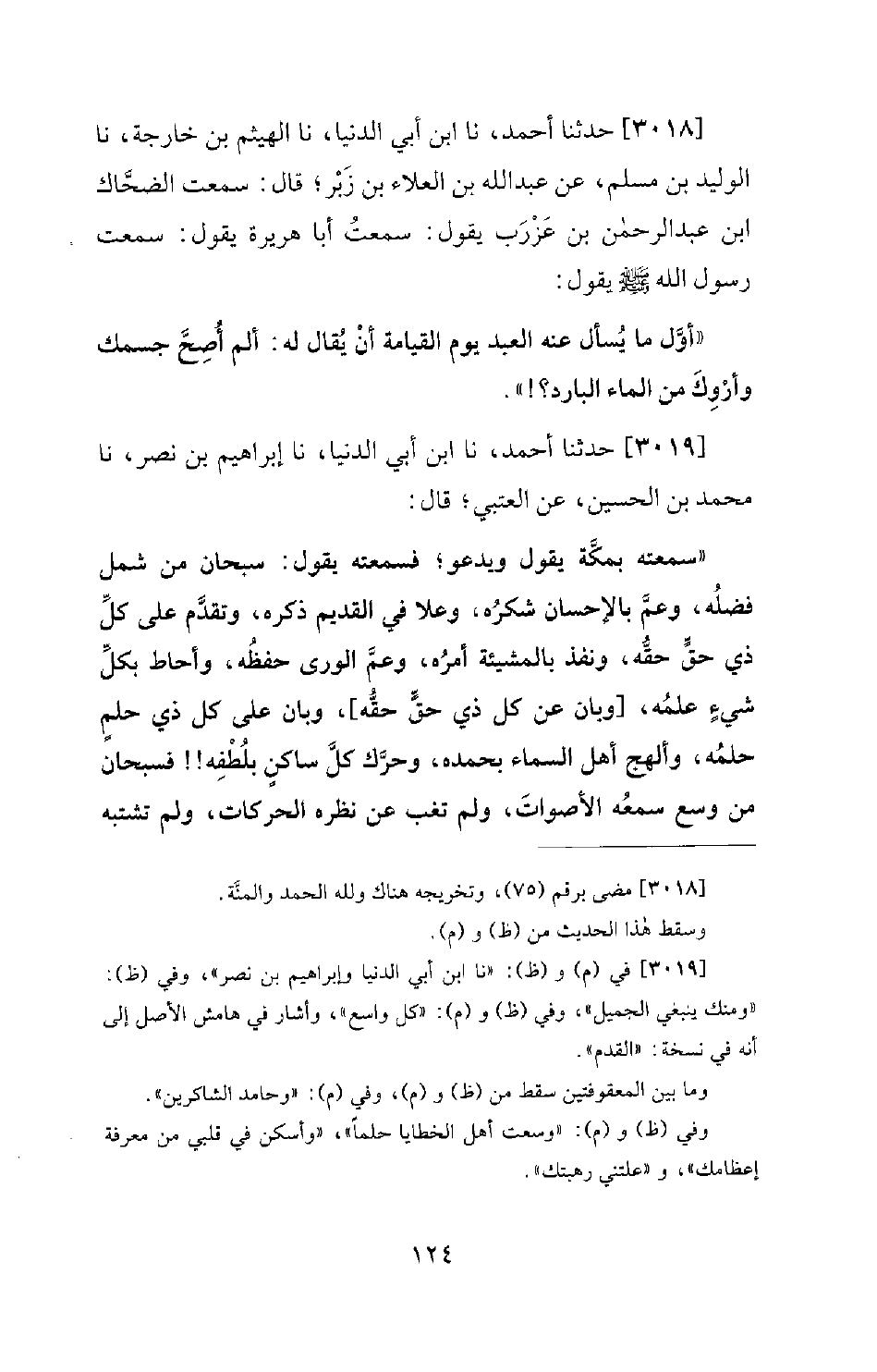 3018 - حَدَّثَنَا أَحْمَدُ، نا ابْنُ أَبِي الدُّنْيَا، نا الْهَيْثَمُ بْنُ خَارِجَةَ، نا الْوَلِيدُ بْنُ مُسْلِمٍ، عَنْ عَبْدِ اللهِ بْنِ الْعَلاءِ بْنِ زَبْرٍ؛ قَالَ: سَمِعْتُ الضَّحَّاكَ بْنَ عَبْدِ الرَّحْمَنِ بْنِ عَزْرَبٍ يَقُولُ: سَمِعْتُ أَبَا هُرَيْرَةَ يَقُولُ: سَمِعْتُ رَسُولَ اللهِ صَلَّى اللَّهُ عَلَيْهِ وَسَلَّمَ يَقُولُ: «أَوَّلُ مَا يُسْأَلُ عَنْهُ الْعَبْدُ يَوْمَ الْقِيَامَةِ أَنْ يُقَالَ لَهُ: أَلَمْ أُصِحَّ جِسْمَكَ وَأَرْوِكَ مِنَ الْمَاءِ الْبَارِدِ؟ !» .