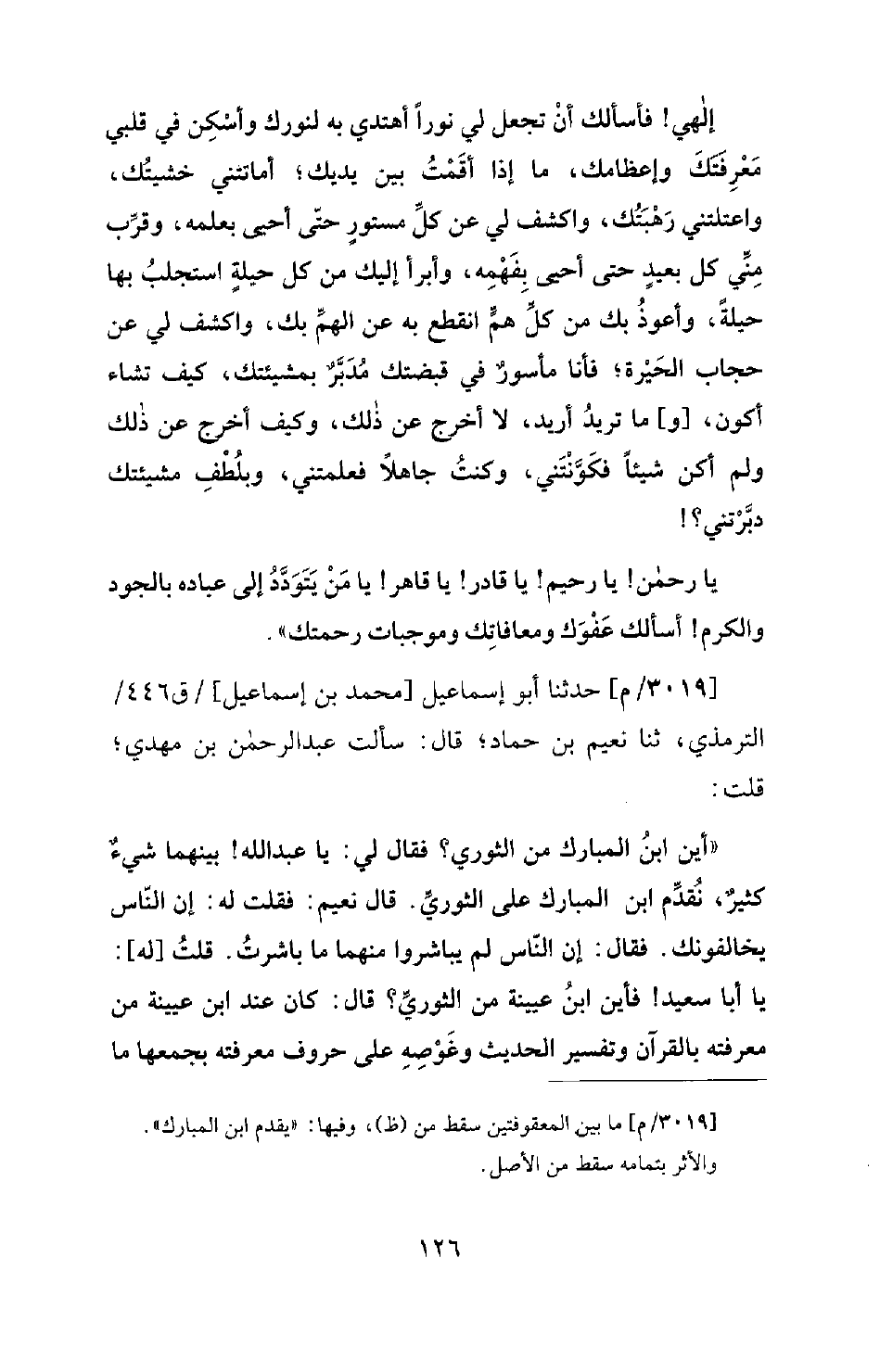 3019 - / م - حَدَّثَنَا أَبُو إِسْمَاعِيلَ مُحَمَّدُ بْنُ إِسْمَاعِيلَ التِّرْمِذِيُّ، ثنا نُعَيْمُ بْنُ حَمَّادٍ؛ قَالَ: سَأَلْتُ عَبْدَ الرَّحْمَنِ بْنَ مَهْدِيٍّ؛ قُلْتُ: أَيْنَ ابْنُ الْمُبَارَكِ مِنَ الثَّوْرِيِّ؟ فَقَالَ لِي: يَا عَبْدَ اللهِ! بَيْنَهُمَا شَيْءٌ كثير، نقدم ابن الْمُبَارَكَ عَلَى الثَّوْرِيِّ. قَالَ نُعَيْمٌ: فَقُلْتُ لَهُ: إِنَّ النَّاسَ يُخَالِفُونَكَ. فَقَالَ: إِنَّ النَّاسَ لَمْ يُبَاشِرُوا مِنْهُمَا مَا بَاشَرْتُ. قُلْتُ لَهُ: يَا أَبَا سَعِيدٍ! فَأَيْنَ ابْنُ عُيَيْنَةَ مِنَ الثَّوْرِيِّ؟ قَالَ: كَانَ عِنْدَ ابْنِ عُيَيْنَةَ مِنْ مَعْرِفَتِهِ بِالْقُرْآنِ وَتَفْسِيرِ الْحَدِيثِ وَغَوْصِهِ عَلَى حُرُوفِ مَعْرِفَتِهِ بِجَمْعِهَا مَا -[127]- لَمْ يَكُنْ عِنْدَ الثَّوْرِيِّ.