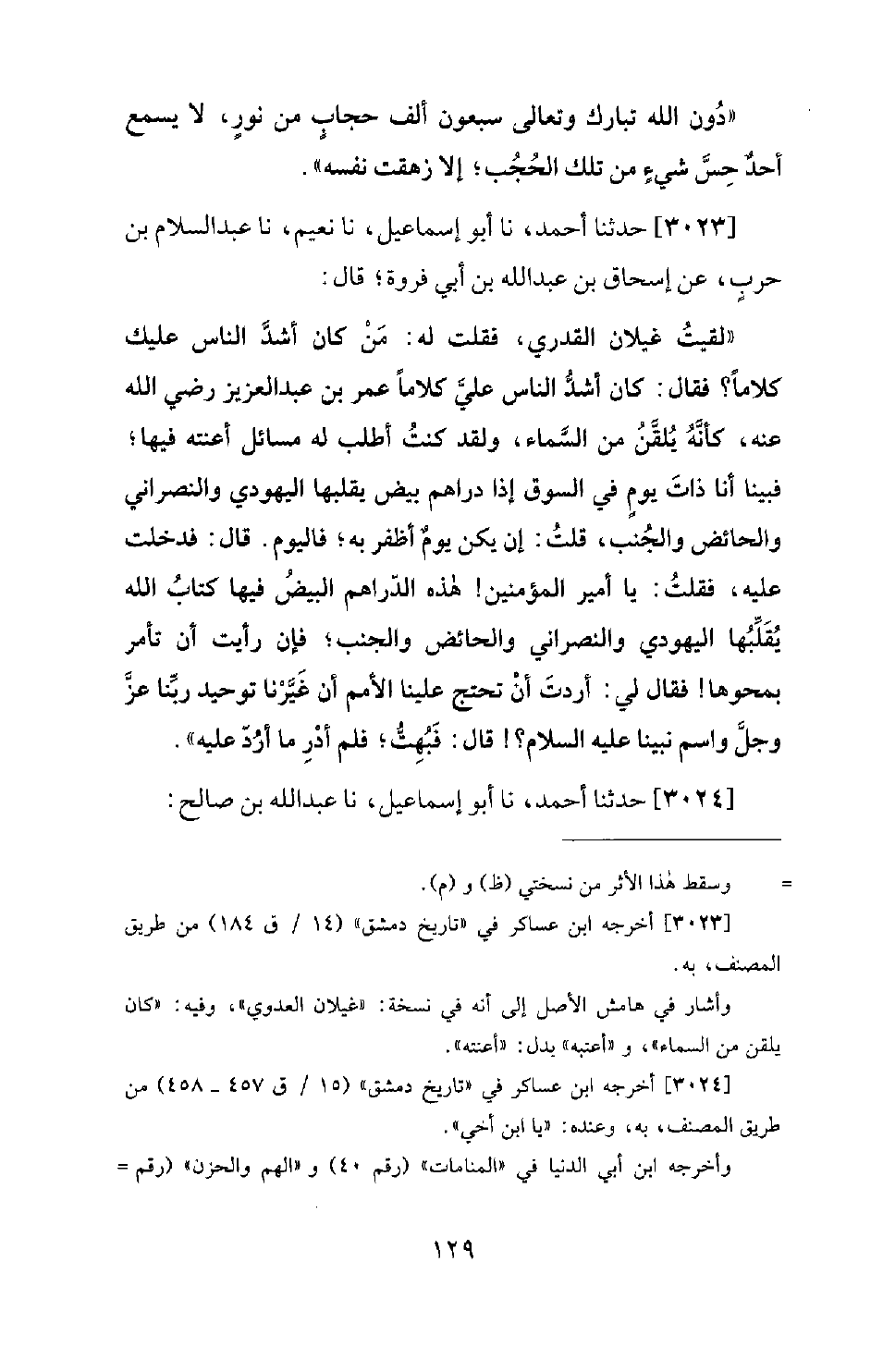 3023 - حَدَّثَنَا أَحْمَدُ، نا أَبُو إِسْمَاعِيلَ، نا نُعَيْمٌ، نا عَبْدُ السَّلامِ بْنُ حَرْبٍ، عَنْ إِسْحَاقَ بْنِ عَبْدِ اللهِ بْنِ أَبِي فَرْوَةَ؛ قَالَ: لَقِيتُ غَيْلانَ الْقَدَرِيَّ، فَقُلْتُ لَهُ: مَنْ كَانَ أَشَدَّ النَّاسِ عَلَيْكَ كَلامًا؟ فَقَالَ: كَانَ أَشَدُّ النَّاسِ عَلَيَّ كَلامًا عُمَرَ بْنَ عَبْدِ الْعَزِيزِ رَضِيَ اللهُ عَنْهُ، كَأَنَّهُ يُلَقَّنُ مِنَ السَّمَاءِ، وَلَقَدْ كُنْتُ أَطْلُبُ لَهُ مَسَائِلَ أَعْنِتُهُ فِيهَا؛ فَبَيْنَا أَنَا ذَاتَ يَوْمٍ فِي السُّوقِ إِذَا دَرَاهِمُ بِيضٍ يُقَلِّبُهَا الْيَهُودِيُّ وَالنَّصْرَانِيُّ وَالْحَائِضُ وَالْجُنُبُ، قُلْتُ: إِنْ يَكُنْ يَوْمٌ أَظْفَرُ بِهِ؛ فَالْيَوْمَ. قَالَ: فَدَخَلْتُ عَلَيْهِ، فَقُلْتُ: يَا أَمِيرَ الْمُؤْمِنِينَ! هَذِهِ الدَّرَاهِمُ الْبِيضُ فِيهَا كِتَابُ اللهِ يُقَلِّبُهَا الْيَهُودِيُّ وَالنَّصْرَانِيُّ وَالْحَائِضُ وَالْجُنُبُ؛ فَإِنْ رَأَيْتَ أَنْ تَأْمُرَ بِمَحْوِهَا! فَقَالَ لِي: أَرَدْتَ أَنْ تَحْتَجَّ عَلَيْنَا الأُمَمُ أَنْ غَيَّرْنَا تَوْحِيدَ رَبِّنَا عَزَّ وَجَلَّ وَاسْمَ نَبِيِّنَا عَلَيْهِ السَّلامُ؟ ! قَالَ: فَبُهِتُّ؛ فَلَمْ أَدْرِ مَا أَرُدُّ عَلَيْهِ.