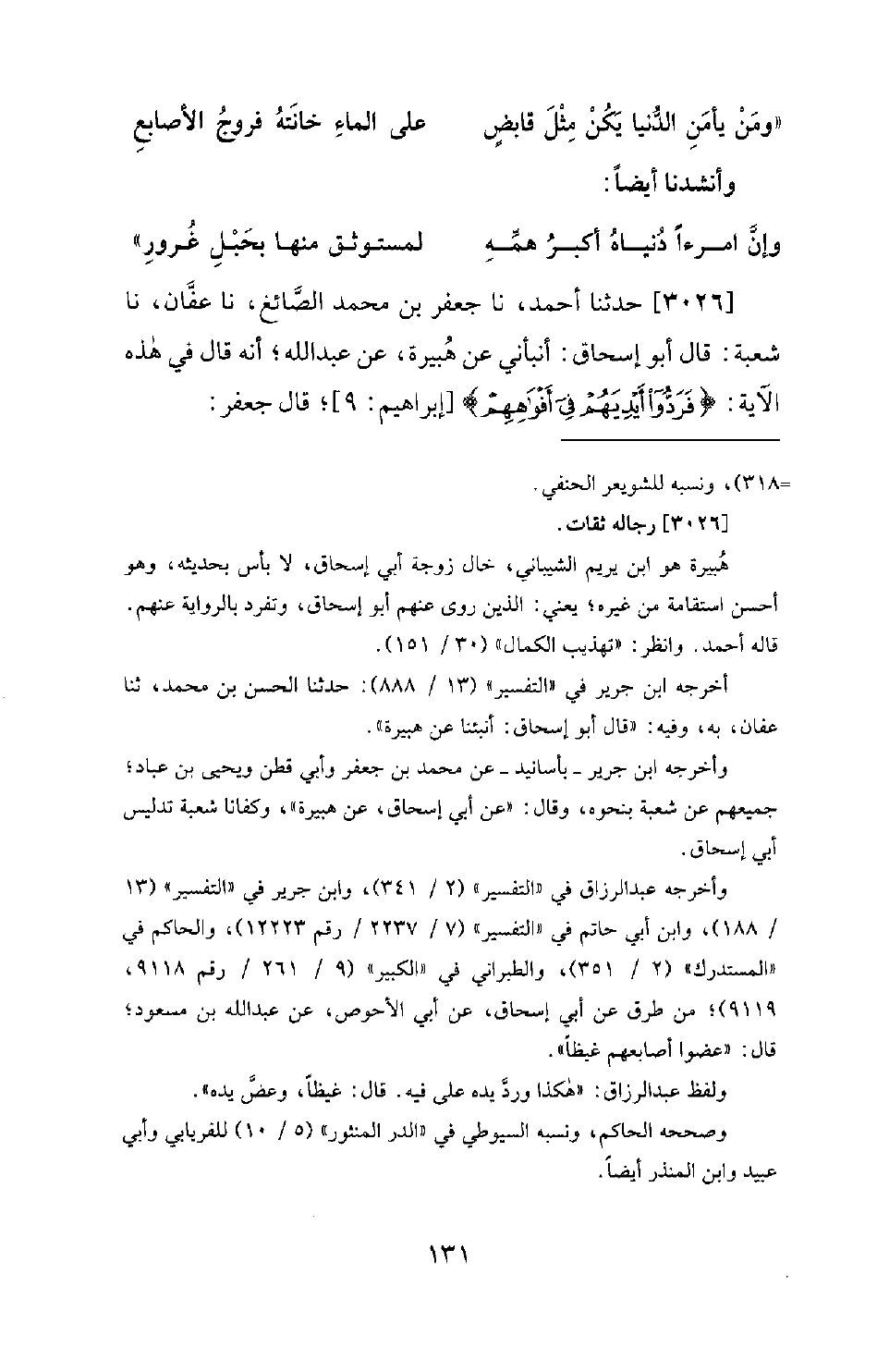 3026 - حَدَّثَنَا أَحْمَدُ، نا جَعْفَرُ بْنُ مُحَمَّدٍ الصَّائِغُ، نا عَفَّانُ، نا شُعْبَةُ قَالَ: أَبُو إِسْحَاقَ أَنْبَأَنِي عَنْ هُبَيْرَةَ، عَنْ عَبْدِ اللهِ؛ أَنَّهُ قَالَ فِي هَذِهِ الآيَةِ: {فَرَدُّوا أَيْدِيَهُمْ فِي أَفْوَاهِهِمْ} [إبراهيم: 9] ؛ قَالَ جَعْفَرٌ: -[132]- أَرَانَا عَفَّانُ، وَأَدْخَلَ أَصَابِعَ كَفِّهِ مَبْسُوطَةً فِي فِيهِ، وَذَكَرَ أَنَّ شعبة أراه كذلك [رجاله ثقات] .