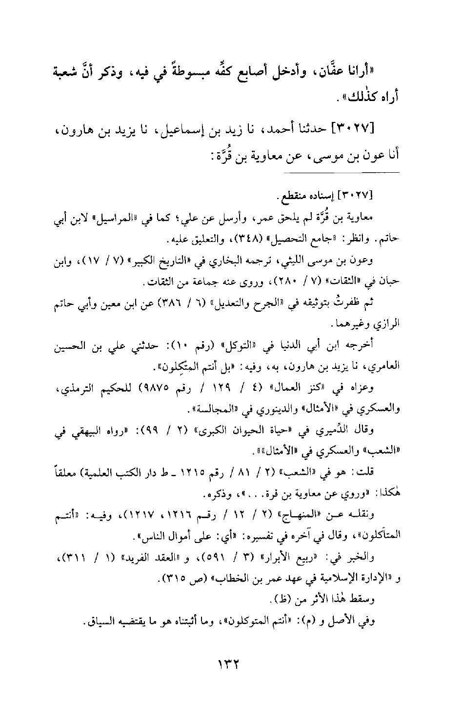 3027 - حَدَّثَنَا أَحْمَدُ، نا زَيْدُ بْنُ إِسْمَاعِيلَ، نا يَزِيدُ بْنُ هَارُونَ، أنا عَوْنُ بْنُ مُوسَى، عَنْ مُعَاوِيَةَ بْنِ قُرَّةَ: -[133]- أَنَّ عُمَرَ بْنَ الْخَطَّابِ رَضِيَ اللهُ عَنْهُ لَقِيَ نَاسًا مِنْ أَهْلِ الْيَمَنِ؛ فَقَالَ: مَنْ أَنْتُمْ؟ قَالُوا: نَحْنُ الْمُتَوَكِّلُونَ. قَالَ: أَنْتُمُ الْمُتَوَاكِلُونَ، إِنَّمَا الْمُتَوَكِّلُ الَّذِي يُلْقِي حَبَّهُ فِي الأَرْضِ وَيَتَوَكَّلُ عَلَى اللهِ عَزَّ وَجَلَّ