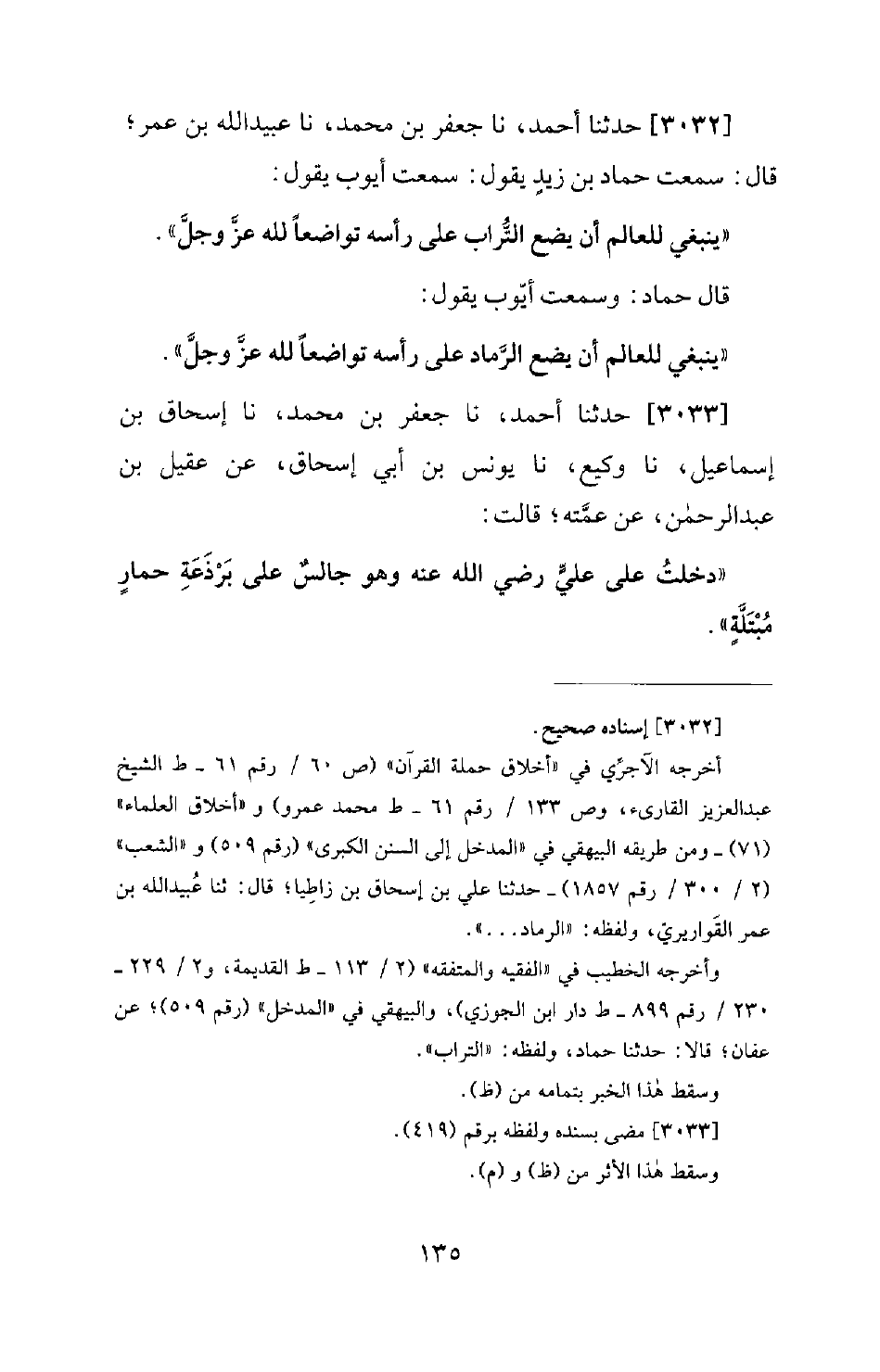3032 - حَدَّثَنَا أَحْمَدُ، نا جَعْفَرُ بْنُ مُحَمَّدٍ، نا عُبَيْدُ اللهِ بْنُ عُمَرَ؛ قَالَ: سَمِعْتُ حَمَّادَ بْنَ زَيْدٍ يَقُولُ: سَمِعْتُ أَيُّوبَ يَقُولُ: يَنْبَغِي لِلْعَالِمِ أَنْ يَضَعَ التُّرَابَ عَلَى رَأْسِهِ تَوَاضُعًا لِلَّهِ عَزَّ وَجَلَّ. قَالَ حَمَّادٌ: وَسَمِعْتُ أَيُّوبَ يَقُولُ: يَنْبَغِي لِلْعَالِمِ أَنْ يَضَعَ الرَّمَادَ عَلَى رَأْسِهِ تَوَاضُعًا لِلَّهِ عَزَّ وَجَلَّ