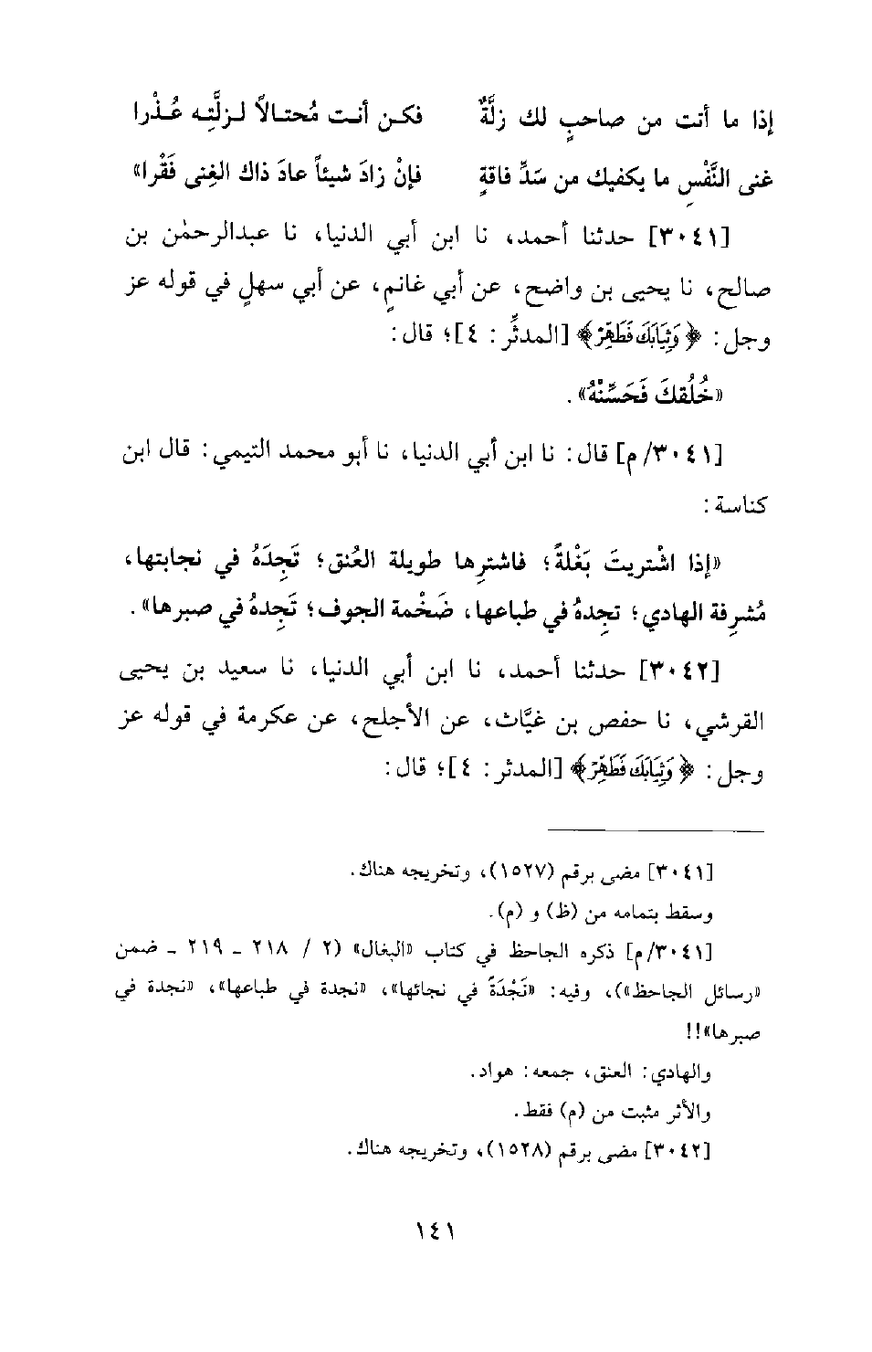 3041 - حَدَّثَنَا أَحْمَدُ، نا ابْنُ أَبِي الدُّنْيَا، نا عَبْدُ الرَّحْمَنِ بْنُ صَالِحٍ، نا يَحْيَى بْنُ وَاضِحٍ، عَنْ أَبِي غَانِمٍ، عَنْ أَبِي سَهْلٍ في قول عَزَّ وَجَلَّ: (وَثِيَابَكَ فَطَهِّرْ (4)) [المدثر: 4] ؛ قَالَ: خُلُقَكَ فَحَسِّنْهُ.