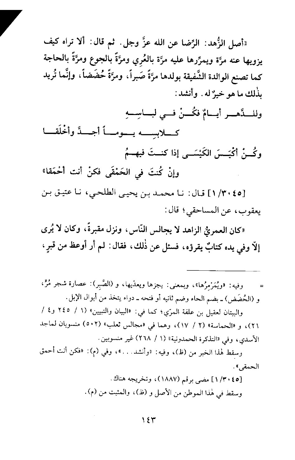 3045 - / 1 - قَالَ: نا مُحَمَّدُ بْنُ يحيى الطلحي، نا عَتِيقُ بْنُ يَعْقُوبَ، عَنِ الْمُسَاحِقِيِّ؛ قَالَ: كَانَ الْعُمَرِيُّ الزَّاهِدُ لا يُجَالِسُ النَّاسَ، وَنَزَلَ مَقْبَرَةً، وَكَانَ لا يُرَى إِلا وَفِي يَدِهِ كِتَابٌ يَقْرَؤُهُ، فَسُئِلَ عَنْ ذَلِكَ فَقَالَ: لَمْ أَرَ أَوْعَظَ مِنْ قَبْرٍ، -[144]- وَلا مُمْتِعًا أَمْتَعَ مِنْ كِتَابٍ، وَلا شَيْئًا أَسْلَمَ مِنَ الْوِحْدَةِ. فَقِيلَ لَهُ: قَدْ جَاءَ فِي الْوِحْدَةِ مَا جَاءَ فِيهَا. فَقَالَ: مَا أَفْسَدَهَا لِلْجَاهِلِ!