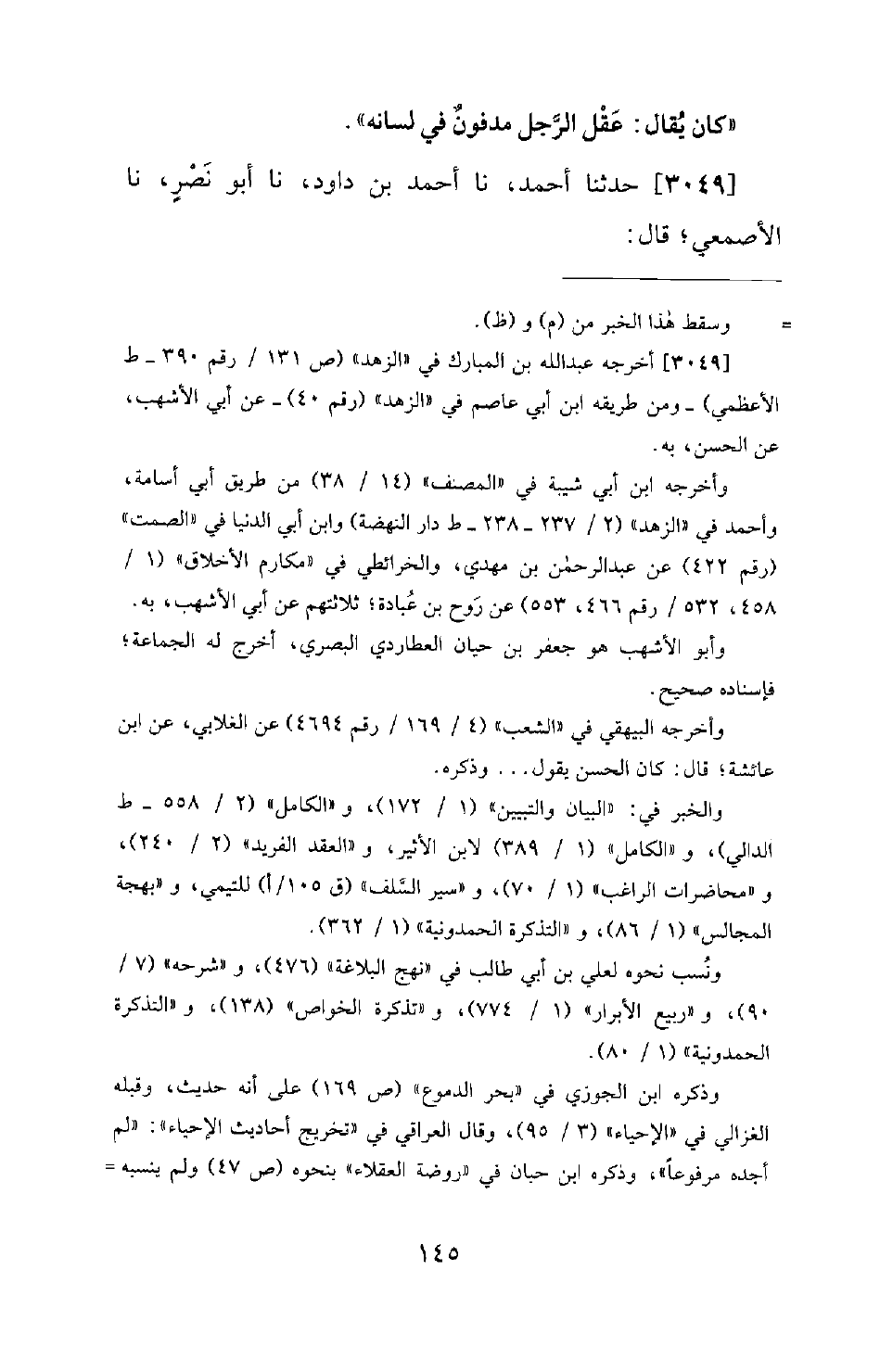 3049 - حَدَّثَنَا أَحْمَدُ، نا أَحْمَدُ بْنُ دَاوُدَ، نا أَبُو نَصْرٍ، نا الأَصْمَعِيُّ؛ قَالَ: -[146]- قَالَ الْحَسَنُ: لِسَانُ الْعَاقِلِ مِنْ وَرَاءِ قَلْبِهِ، فَإِذَا أَرَادَ الْكَلامَ تَفَكَّرَ، فَإِنْ كَانَ لَهُ قَالَ، وَإِنْ كَانَ عَلَيْهِ أَمْسَكَ، وَقَلْبُ الْجَاهِلِ مِنْ وَرَاءِ لِسَانِهِ، فَإِنْ هَمَّ بِالْكَلامِ تَكَلَّمَ لَهُ وعليه.