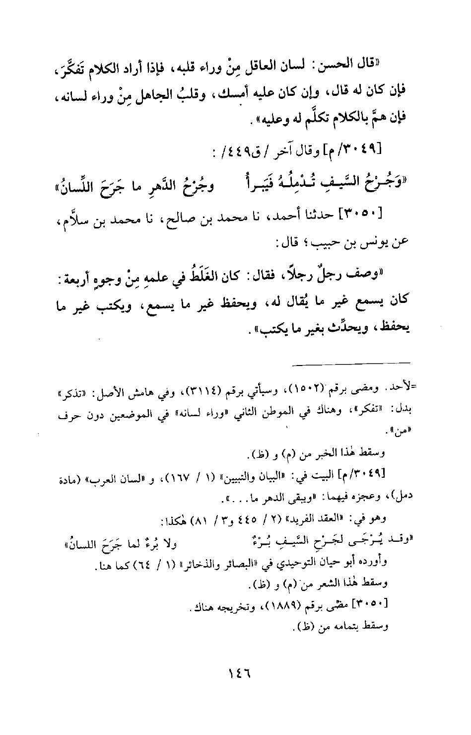 3050 - حَدَّثَنَا أَحْمَدُ، نا مُحَمَّدُ بْنُ صَالِحٍ، نا مُحَمَّدُ بْنُ سَلامٍ، عَنْ يُونُسَ بْنِ حَبِيبٍ؛ قَالَ: وَصَفَ رَجُلٌ رَجُلا، فَقَالَ: كَانَ الْغَلَطُ فِي عِلْمِهِ مِنْ وُجُوهٍ أَرْبَعَةٍ: كَانَ يَسْمَعُ غَيْرَ مَا يُقَالُ لَهُ، وَيَحْفَظُ غَيْرَ مَا يَسْمَعُ، وَيَكْتُبُ غَيْرَ مَا يَحْفَظُ، وَيُحَدِّثُ بِغَيْرِ مَا يَكْتُبُ.