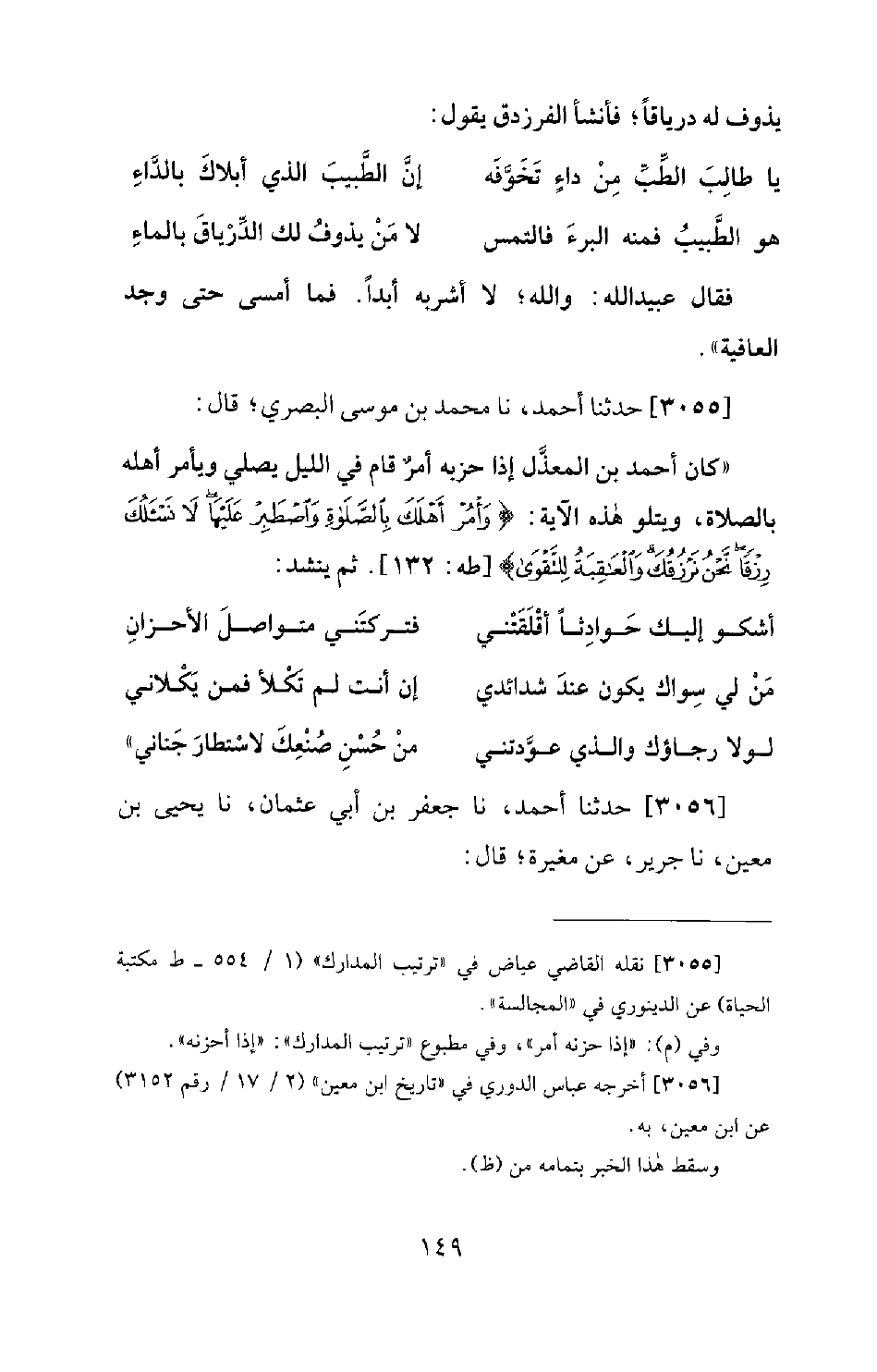 3055 - حَدَّثَنَا أَحْمَدُ، نا مُحَمَّدُ بْنُ مُوسَى الْبَصْرِيُّ؛ قَالَ: كَانَ أَحْمَدُ بْنُ الْمُعَذَّلِ إِذَا حَزَبَهُ أَمْرٌ قَامَ فِي اللَّيْلِ يُصَلِّي وَيَأْمُرُ أَهْلَهُ بِالصَّلاةِ، وَيَتْلُو هَذِهِ الآيَةَ: (وَأْمُرْ أَهْلَكَ بِالصَّلَاةٍ وَاصْطَبِرْ عَلَيْهَا لَا نَسْئَلُكَ رِزْقًا نَّحْنُ نَرْزُقُكَ وَالْعَاقِبَةُ لِلتَّقْوَى (132)) [طه: 132] . ثُمَّ يُنْشِدُ: