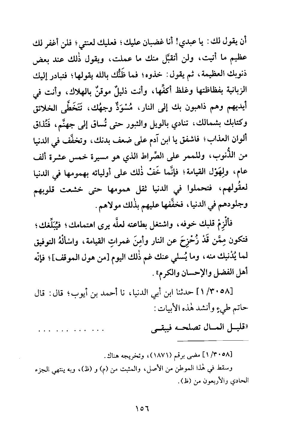 3058 - / 1 م - حَدَّثَنَا ابْنُ أَبِي الدُّنْيَا، نا أَحْمَدُ بْنُ أَيُّوبَ؛ قَالَ: قَالَ حَاتِمُ طَيْءٍ وَأَنْشَدَ هَذِهِ الأَبْيَاتِ: