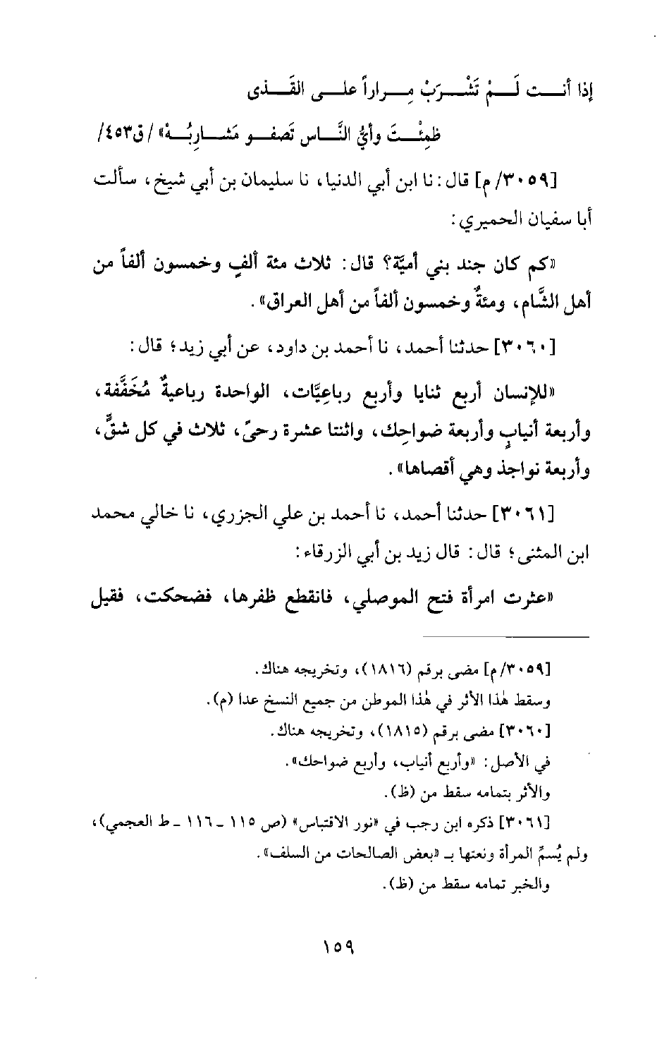 3059 - / م - قَالَ: نا ابْنُ أَبِي الدُّنْيَا، نا سُلَيْمَانُ بْنُ أَبِي شَيْخٍ، سَأَلْتُ أَبَا سُفْيَانَ الْحِمْيَرِيّ: كَمْ كَانَ جُنْدُ بَنِي أمية؟ قال: ثلاث مئة أَلْفٍ وَخَمْسُونَ أَلْفًا مِنْ أهل الشام، ومئة وَخَمْسُونَ أَلْفًا مِنْ أَهْلِ الْعِرَاقِ.