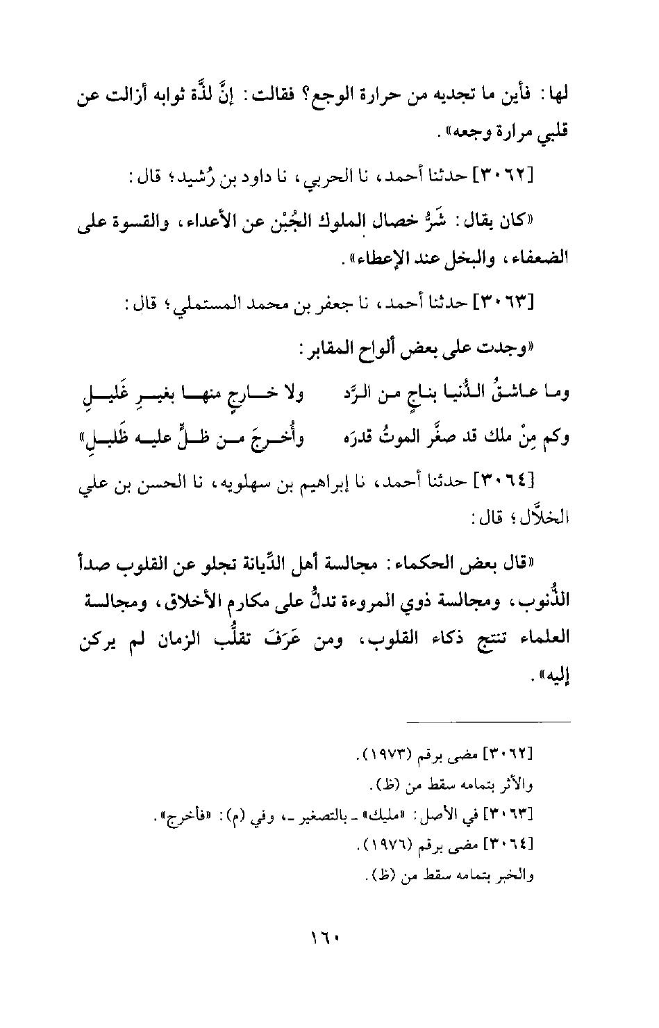 3064 - حَدَّثَنَا أَحْمَدُ، نا إِبْرَاهِيمُ بْنُ سَهْلَوَيْهِ، نا الْحَسَنُ بْنُ عَلِيٍّ الْخَلالُ؛ قَالَ: قَالَ بَعْضُ الْحُكَمَاءِ: مُجَالَسَةُ أَهْلِ الدِّيَانَةِ تَجْلُو عَنِ الْقُلُوبِ صَدَأَ الذُّنُوبِ، وَمُجَالَسَةُ ذَوِي الْمُرُوءَةِ تَدُلُّ عَلَى مَكَارِمِ الأَخْلاقِ، وَمُجَالَسَةُ الْعُلَمَاءِ تُنْتِجُ ذَكَاءَ الْقُلُوبِ، وَمَنْ عَرَفَ تَقَلُّبَ الزَّمَانِ لَمْ يَرْكَنْ إِلَيْهِ.