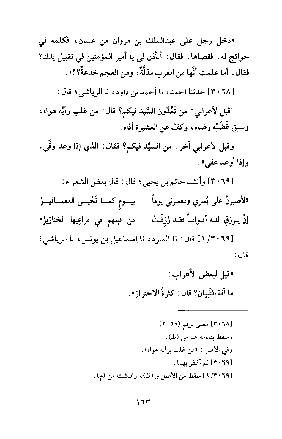 3068 - حَدَّثَنَا أَحْمَدُ، نا أَحْمَدُ بْنُ دَاوُدَ، نا الرِّيَاشِيُّ؛ قَالَ: قِيلَ لِأَعْرَابِيٍّ: مَنْ تَعُدُّونَ السَّيِّدَ فِيكُمْ؟ قَالَ: مَنْ غَلَبَ رَأْيُهُ هَوَاهُ، وَسَبَقَ غَضَبَهُ رِضَاهُ، وَكَفَّ عَنِ الْعَشِيرَةِ أَذَاهُ. وقيل لأعرابي آخر: من السَّيِّدُ فِيكُمْ؟ فَقَالَ: الَّذِي إِذَا وَعَدَ وَفَّى، وَإِذَا أَوْعَدَ عَفَى.