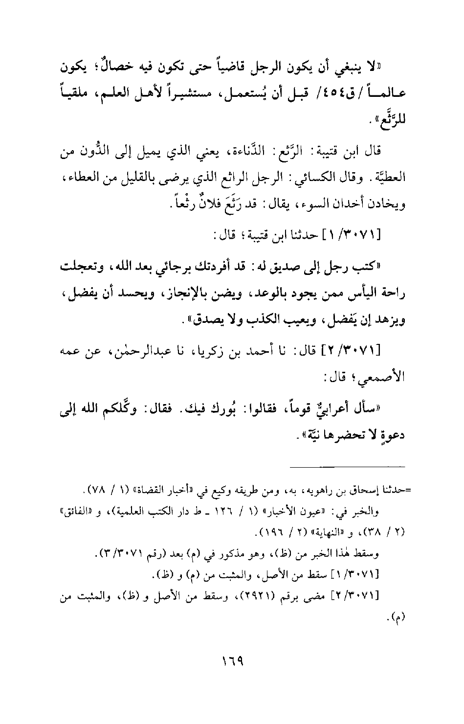3071 - / 2 م - قَالَ: نا أَحْمَدُ بْنُ زَكَرِيَّا، نا عَبْدُ الرَّحْمَنِ، عَنْ عَمِّهِ الأَصْمَعِيِّ؛ قَالَ: سَأَلَ أَعْرَابِيٌّ قَوْمًا، فَقَالُوا: بُورِكَ فِيكَ. فَقَالَ: وَكَّلَكُمُ اللهُ إِلَى دَعْوَةٍ لا تحضرها نية.