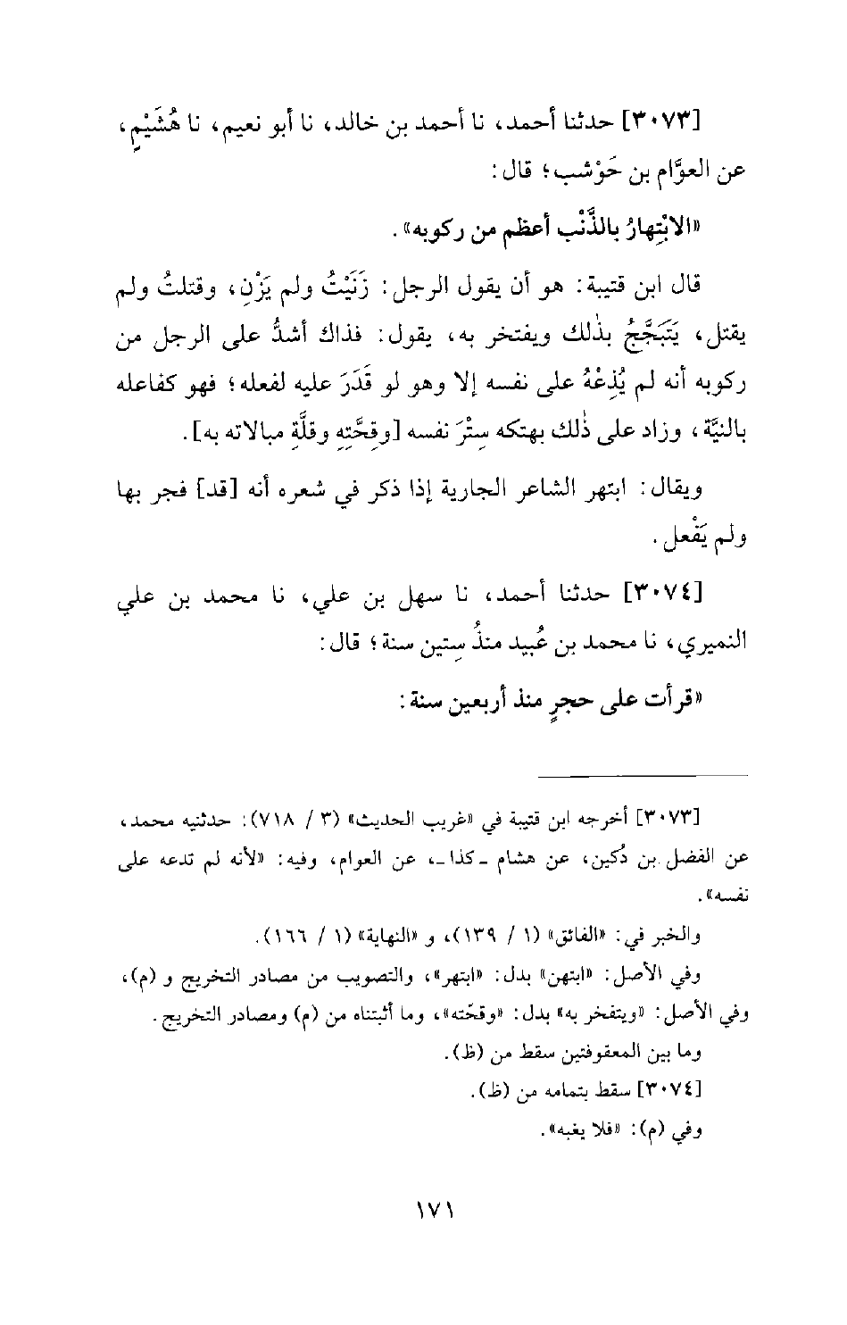3073 - حَدَّثَنَا أَحْمَدُ، نا أَحْمَدُ بْنُ خَالِدٍ، نا أَبُو نُعَيْمٍ، نا هُشَيْمٌ، عَنِ الْعَوَّامِ بْنِ حَوْشَبٍ؛ قَالَ: الابْتِهَارُ بِالذَّنْبِ أَعْظَمُ مِنْ رُكُوبِهِ. قَالَ ابْنُ قُتَيْبَةَ: هُوَ أَنْ يَقُولَ الرَّجُلُ: زَنَيْتُ، وَلَمْ يَزْنِ، وَقَتَلْتُ؛ وَلَمْ يَقْتُلْ، يَتَبَجَّحُ بِذَلِكَ وَيَفْتَخِرُ بِهِ، يَقُولُ: فَذَاكَ أَشَدُّ عَلَى الرَّجُلِ مِنْ رُكُوبِهِ أَنَّهُ لَمْ يُذِعْهُ عَلَى نَفْسِهِ إِلا وَهُوَ لَوْ قَدَرَ عَلَيْهِ لَفَعَلَهُ؛ فَهُوَ كَفَاعِلِهِ بِالنِّيَّةِ، وَزَادَ عَلَى ذَلِكَ بِهَتْكِهِ سِتْرَ نَفْسِهِ وَقِحَّتِهِ وَقِلَّةِ مُبَالاتِهِ بِهِ. وَيُقَالُ: ابْتَهَرَ الشَّاعِرُ الْجَارِيَةَ إِذَا ذَكَرَ فِي شِعْرِهِ أَنَّهُ قَدْ فَجَرَ بِهَا وَلَمْ يَفْعَلْ.