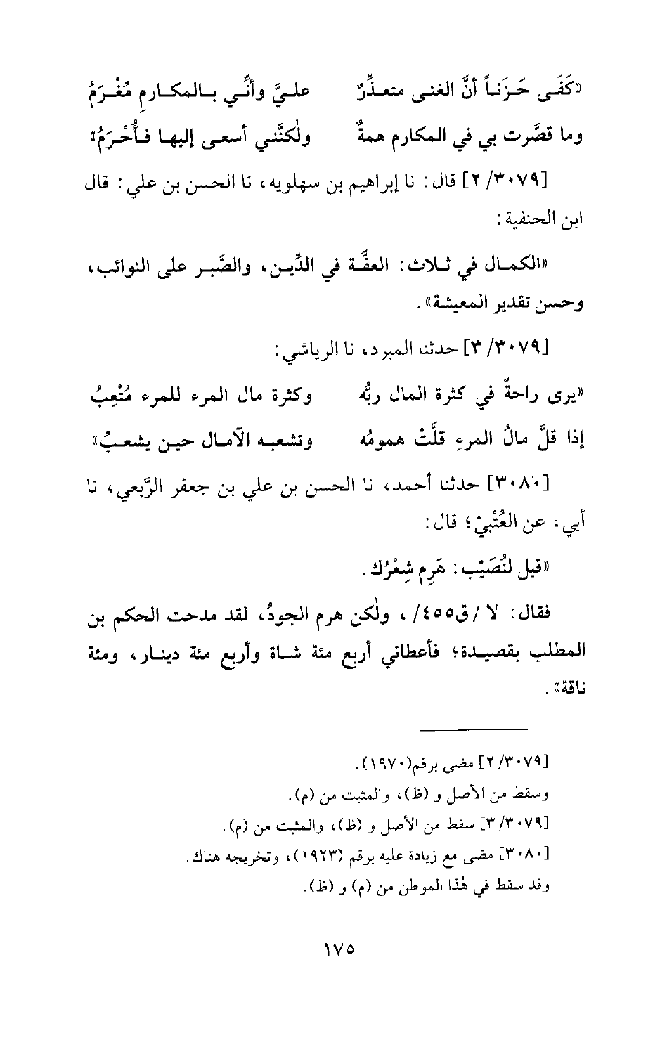 3079 - / 2 م - قَالَ: نا إِبْرَاهِيمُ بْنُ سَهْلَوَيْهِ، نا الْحَسَنُ بْنُ عَلِيٍّ: قَالَ ابْنُ الْحَنَفِيَّةِ: الْكَمَالُ فِي ثَلاثٍ: الْعِفَّةِ فِي الدِّينِ، وَالصَّبْرِ عَلَى النَّوَائِبِ، وَحُسْنِ تَقْدِيرِ الْمَعِيشَةِ.