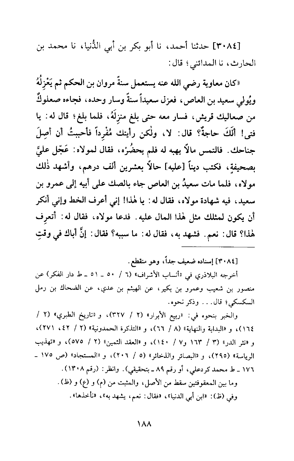 3084 - حَدَّثَنَا أَحْمَدُ، نا أَبُو بَكْرِ بْنُ أَبِي الدُّنْيَا، نا مُحَمَّدُ بْنُ الْحَارِثِ، نا الْمَدَائِنِيُّ؛ قَالَ: كَانَ مُعَاوِيَةُ رَضِيَ اللهُ عَنْهُ يَسْتَعْمِلُ سَنَةً مَرْوَانَ بْنَ الْحَكَمِ ثُمَّ يَعْزِلُهُ وَيُوَلِّي سَعِيدَ بْنَ الْعَاصِ، فَعَزَلَ سَعِيدًا سَنَةً وَسَارَ وحده، فجاءه صُعْلُوكٌ مِنْ صَعَالِيكِ قُرَيْشٍ، فَسَارَ مَعَهُ حَتَّى بَلَغَ مَنْزِلَهُ، فَلَمَّا بَلَغَ؛ قَالَ لَهُ: يَا فَتَى! أَلَكَ حَاجَةٌ؟ قَالَ: لا، وَلَكِنْ رَأَيْتُكَ مُفْرِدًا فَأَحْبَبْتُ أَنْ أَصِلَ جَنَاحَكَ. فَالْتَمَسَ مَالا يَهَبُهُ لَهُ فَلَمْ يَحْضُرْهُ، فَقَالَ لِمَوْلاهُ: عَجِّلْ عَلَيَّ بِصَحِيفَةٍ، فَكَتَبَ دَيْنًا عَلَيْهِ حَالا بِعِشْرِينَ أَلْفَ دِرْهَمٍ، وَأَشْهَدَ ذَلِكَ مَوْلاهُ، فَلَمَّا مَاتَ سَعِيدُ بْنُ الْعَاصِ جَاءَ بِالصَّكِّ عَلَى أَبِيهِ إِلَى عَمْرِو بْنِ سَعِيدٍ، فِيهِ شَهَادَةُ مَوْلاهُ، فَقَالَ لَهُ: يَا هَذَا! إِنِّي أَعْرِفُ الْخَطَّ وَإِنِّي أُنْكِرُ أَنْ يَكُونَ لِمِثْلِكَ مِثْلُ هَذَا الْمَالِ عَلَيْهِ. فَدَعَا مَوْلاهُ، فَقَالَ لَهُ: أَتَعْرِفُ هَذَا؟ قَالَ: نَعَمْ. فَشَهِدَ به، فقال: مَا سَبَبُهُ؟ فَقَالَ: إِنَّ أَبَاكَ فِي وَقْتِ -[189]- عَزْلِهِ كَانَ مِنْ قِصَّتِهِ كَيْتَ وَكَيْتَ. فَقَالَ عَمْرٌو: إِذًا وَاللهِ لا يَأْخُذُهَا إِلا مُعَجَّلَةً مُنْتَقِدَةً