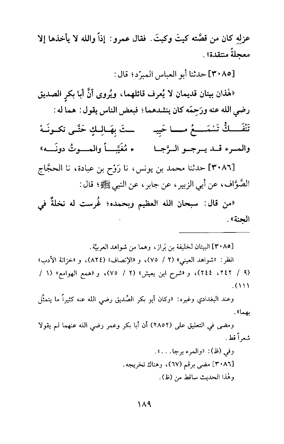 3085 - حَدَّثَنَا أَبُو الْعَبَّاسِ الْمُبَرِّدُ؛ قَالَ: هَذَانِ بَيْتَانِ قَدِيمَانِ لا يُعْرَفُ قَائِلُهُمَا، وَيُرْوَى أَنَّ أَبَا بَكْرٍ الصِّدِّيقَ رَضِيَ اللهُ عَنْهُ وَرَحِمَهُ كَانَ يُنْشِدُهُمَا؛ فَبَعْضُ النَّاسِ يَقُولُ: هُمَا لَهُ: