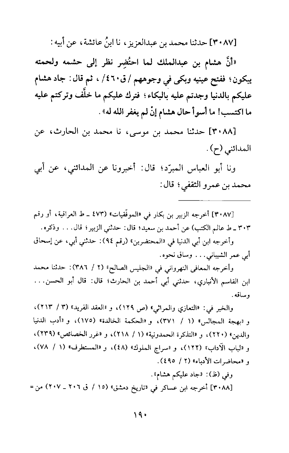 3087 - حدَّثَنَا مُحَمَّدُ بْنُ عَبْدِ الْعَزِيزِ، نا ابْنُ عَائِشَةَ، عَنْ أَبِيهِ: أَنَّ هِشَامَ بْنَ عَبْدِ الْمَلِكِ لَمَّا احْتُضِرَ نَظَرَ إِلَى حَشَمِهِ وَلَحْمَتِهِ يَبْكُونَ؛ فَفَتَحَ عَيْنَيْهِ وَبَكَى فِي وُجُوهِهِمْ، ثُمَّ قَالَ: جَادَ هِشَامٌ عَلَيْكُمْ بِالدُّنْيَا وَجُدْتُمْ عَلَيْهِ بِالْبُكَاءِ؛ فَتَرَكَ عَلَيْكُمْ مَا خَلَّفَ وَتَرَكْتُمْ عَلَيْهِ مَا اكْتَسَبَ! مَا أَسْوَأَ حَالَ هِشَامٍ إِنْ لَمْ يَغْفِرِ اللهُ لَهُ.