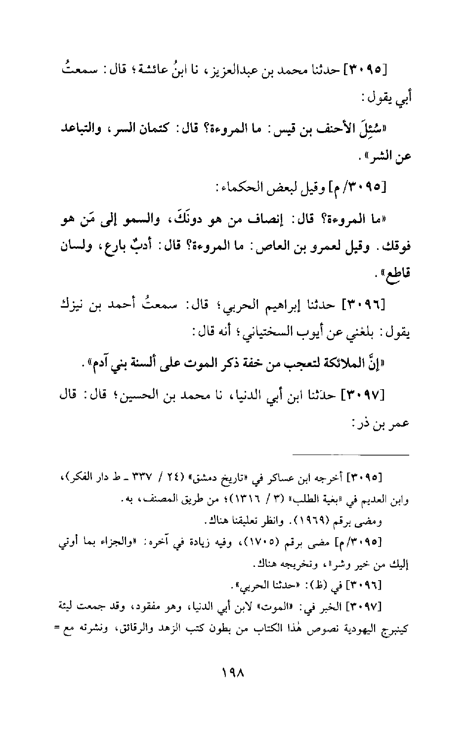 3095 - حَدَّثَنَا مُحَمَّدُ بْنُ عَبْدِ الْعَزِيزِ، نا ابْنُ عَائِشَةَ؛ قَالَ: سَمِعْتُ أَبِي يَقُولُ: سُئِلَ الأَحْنَفُ بْنُ قَيْسٍ: مَا الْمُرُوءَةُ؟ قَالَ: كِتْمَانُ السِّرِّ، وَالتَّبَاعُدُ عن الشر.