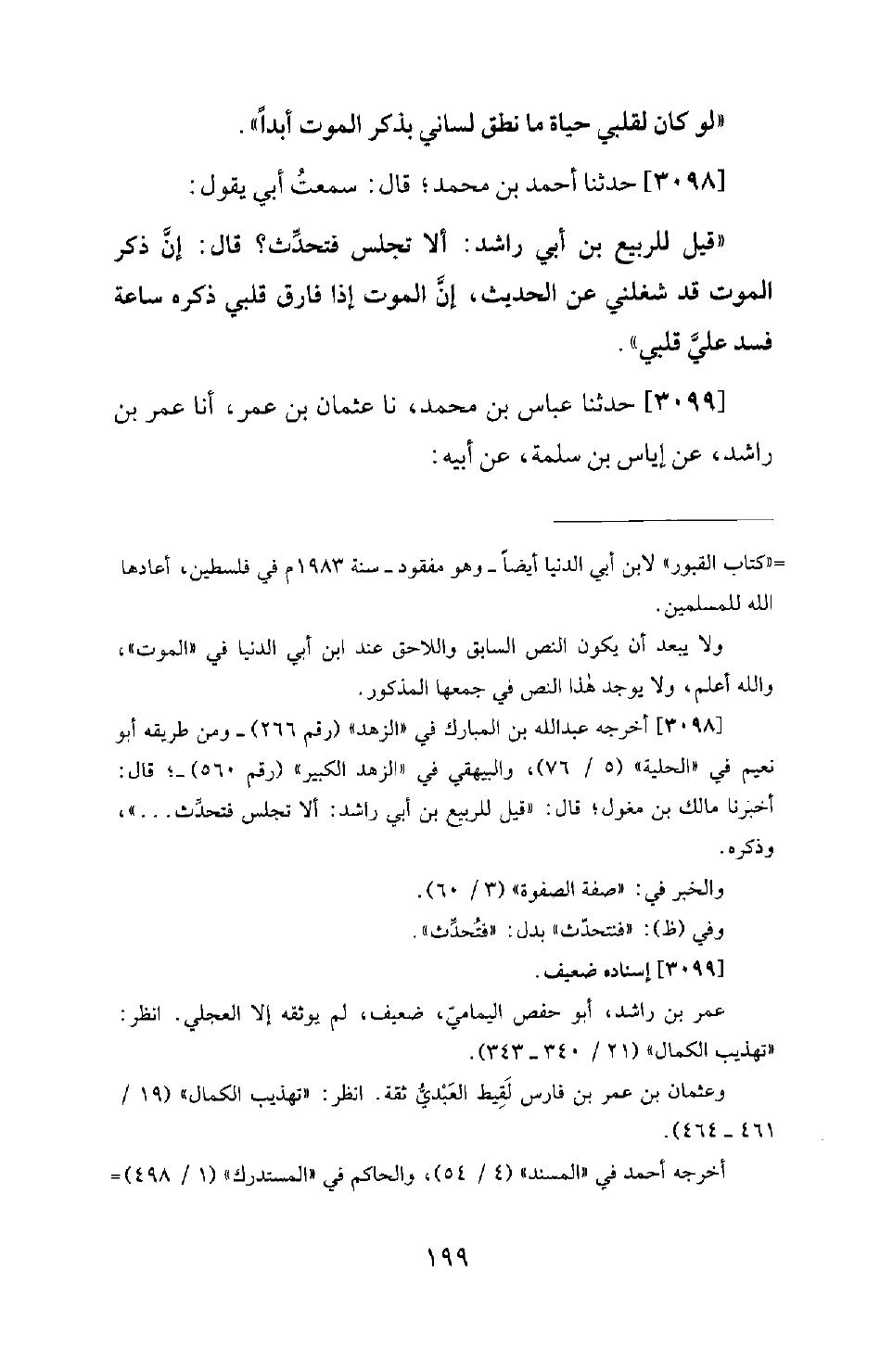 3098 - حَدَّثَنَا أَحْمَدُ بْنُ مُحَمَّدٍ؛ قَالَ: سَمِعْتُ أَبِي يَقُولُ: قِيلَ لِلرَّبِيعِ بْنِ أَبِي رَاشِدٍ: أَلا تَجْلِسُ فَتُحَدِّثَ؟ قَالَ: إِنَّ ذِكْرَ الْمَوْتِ قَدْ شَغَلَنِي عَنِ الْحَدِيثِ، إِنَّ الْمَوْتَ إِذَا فَارَقَ قَلْبِي ذِكْرُهُ سَاعَةً فَسَدَ عَلَيَّ قَلْبِي.