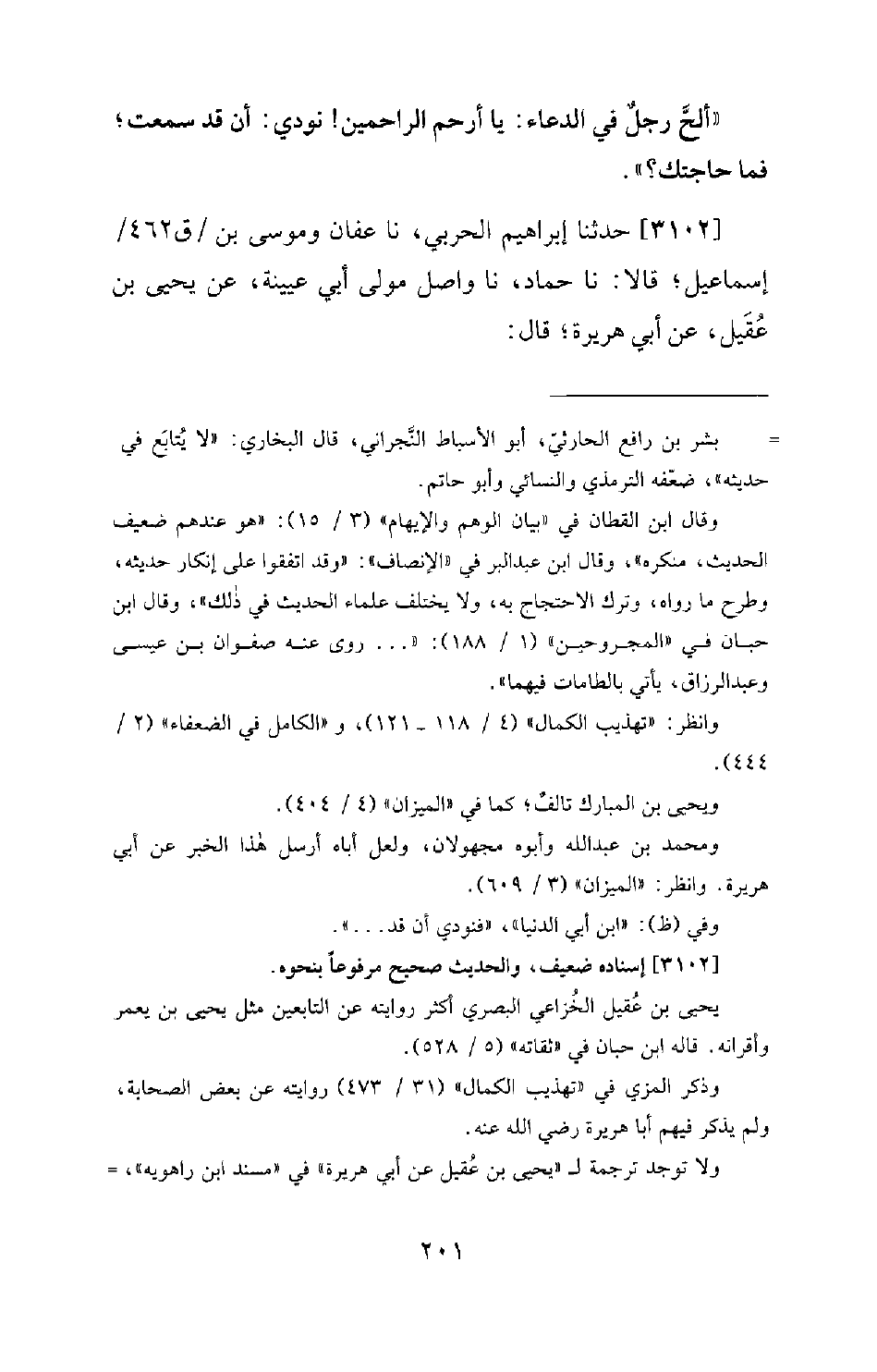 3102 - حَدَّثَنَا إِبْرَاهِيمُ الْحَرْبِيُّ، نا عَفَّانُ وَمُوسَى بْنُ إِسْمَاعِيلَ؛ قَالا: نا حَمَّادٌ، نا وَاصِلٌ مَوْلَى أَبِي عُيَيْنَةَ، عَنْ يَحْيَى بْنِ عُقَيْلٍ، عَنْ أَبِي هُرَيْرَةَ؛ قَالَ: -[202]- يَقْتَصُّ اللهُ عَزَّ وَجَلَّ يَوْمَ الْقِيَامَةِ لِبَعْضِهِمْ مِنْ بَعْضٍ؛ حَتَّى الْجَمَّاءُ مِنَ الْقَرْنَاءِ وَكَذَا وَكَذَا، وَالذَّرَّةُ مِنَ الذَّرَّةِ