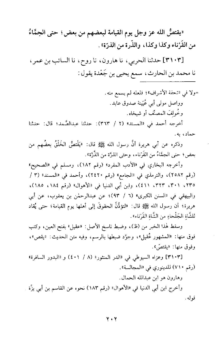 3103 - حدَّثَنَا الْحَرْبِيُّ، نا هَارُونُ، نا رَوْحٌ، نا السَّائِبُ بْنُ عُمَرَ، نا مُحَمَّدُ بْنُ الْحَارِثِ، سَمِعَ يَحْيَى بْنَ جَعْدَةَ -[203]- يَقُولُ: إِنَّ أَوَّلَ خَلْقِ اللهِ عَزَّ وَجَلَّ يُحَاسَبُ يَوْمَ الْقِيَامَةِ الدَّوَابُّ وَالْهَوَامُّ؛ حَتَّى يَقْضِيَ بَيْنَهَا حَتَّى لا يَذْهَبَ شَيْءٌ بظلامة، ثُمَّ يَجْعَلُهَا تُرَابًا، ثُمَ يَبْعَثُ الثَّقَلَيْنِ الْجِنَّ وَالإِنْسَ فَيُحَاسِبُهُمْ؛ فَذَلِكَ يَوْمَئِذٍ يَتَمَنَّى الْكَافِرُ {يَا لَيْتَنِي كنت ترابا} [النبأ: 40] .