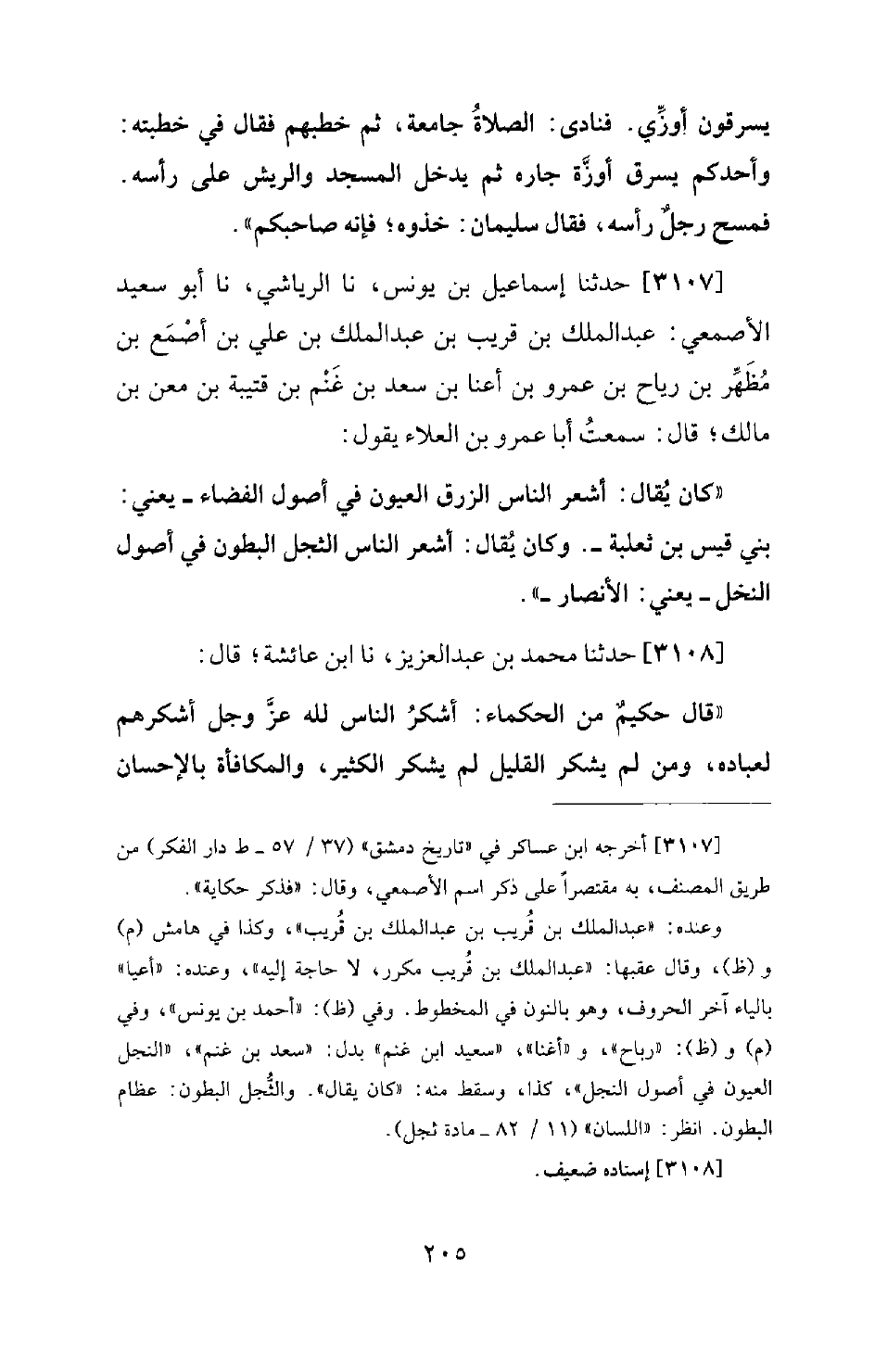 3107 - حَدَّثَنَا إِسْمَاعِيلُ بْنُ يُونُسَ، نا الرِّيَاشِيُّ، نا أَبُو سَعِيدٍ الأَصْمَعِيُّ عَبْدُ الْمَلِكِ بْنُ قَرِيبِ بْنِ عَبْدِ الْمَلِكِ بْنِ عَلِيِّ بْنِ أَصْمَعَ بْنِ مُظَهِّرِ بْنِ رِيَاحِ بْنِ عَمْرِو بْنِ أَعنا بْنِ سَعْدِ بْنِ غَنْمِ بْنِ قُتَيْبَةَ بْنِ مَعْنِ بْنِ مَالِكٍ؛ قَالَ: سَمِعْتُ أَبَا عَمْرِو بْنَ الْعَلاءِ يَقُولُ: كَانَ يُقَالُ: أَشْعَرُ النَّاسِ الزُّرْقُ الْعُيُونِ فِي أُصُولِ الْفَضَاءِ - يَعْنِي: بَنِي قَيْسِ بْنِ ثَعْلَبَةَ -. وَكَانَ يُقَالُ: أَشْعَرُ النَّاسِ الثُّجْلُ الْبُطُونِ فِي أُصُولِ النَّخْلِ - يَعْنِي: الأَنْصَارَ -.