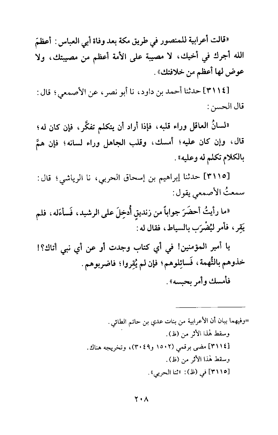3115 - حَدَّثَنَا إِبْرَاهِيمُ بْنُ إِسْحَاقَ الْحَرْبِيُّ، نا الرِّيَاشِيُّ؛ قَالَ: سَمِعْتُ الأَصْمَعِيَّ يَقُولُ: مَا رَأَيْتُ أَحْضَرَ جَوَابًا مِنْ زِنْدِيقٍ أُدْخِلَ عَلَى الرشيد، فساءله، فَلَمْ يُقِرَّ، فَأَمَرَ لِيُضْرَبْ بِالسِّيَاطِ، فَقَالَ لَهُ: يَا أَمِيرَ الْمُؤْمِنِينَ! فِي أَيِّ كِتَابٍ وَجَدْتَ أَوْ عَنْ أَيِّ نَبِيٍّ أَتَاكَ: خُذُوهُمْ بِالتُّهْمَةِ، فَسَائِلُوهُمْ؛ فَإِنْ لَمْ يُقِرُّوا؛ فَاضْرِبُوهُمْ؟ ! فَأَمْسَكَ وَأَمَرَ بِحَبْسِهِ.