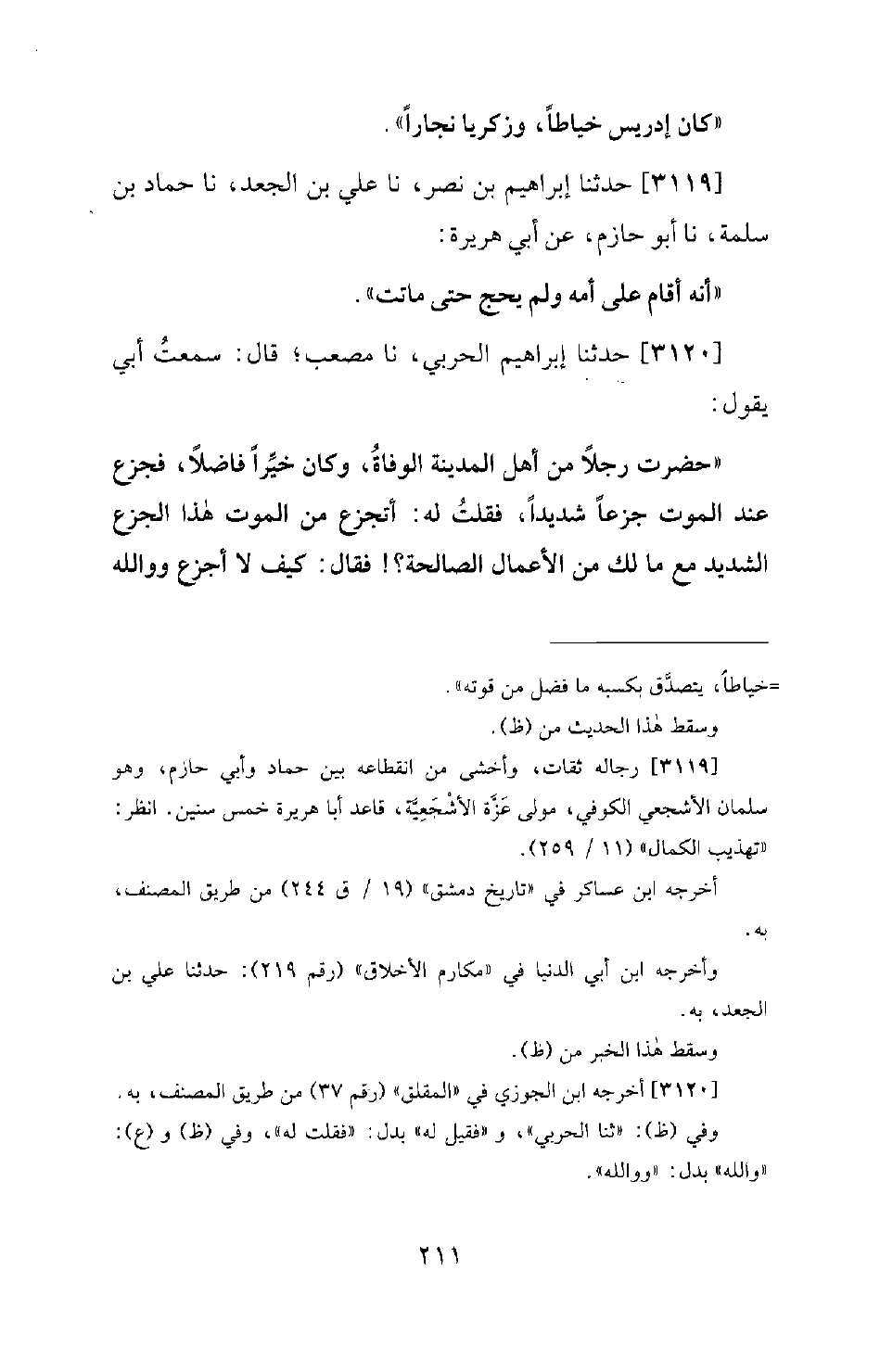 3119 - حَدَّثَنَا إِبْرَاهِيمُ بْنُ نَصْرٍ، نا عَلِيُّ بْنُ الْجَعْدِ، نا حَمَّادُ بْنُ سَلَمَةَ، نا أَبُو حَازِمٍ، عَنْ أَبِي هُرَيْرَةَ: أَنَّهُ أَقَامَ عَلَى أُمِّهِ وَلَمْ يَحُجَّ حَتَّى مَاتَتْ [رجاله ثقات] .