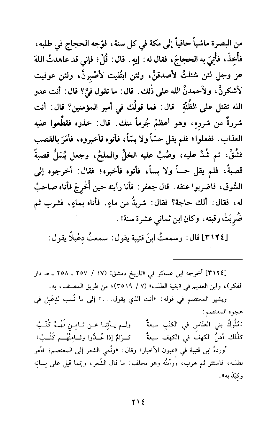 3124 - قَالَ: وَسَمِعْتُ ابْنَ قُتَيْبَةَ يَقُولُ: سَمِعْتُ دِعْبَلا يَقُولُ: -[215]- أُدْخِلْتُ عَلَى الْمُعْتَصِمِ، فَقَالَ لِي: يَا عَدُوَّ اللهِ! أَنْتَ الَّذِي تَقُولُ فِي بَنِي الْعَبَّاسِ: إِنَّهُمْ فِي الْكُتُبِ أنَّهُمْ سَبْعَةٌ؟ ! وَأَمَرَ بِضَرْبِ عُنُقِي، وَمَا كَانَ فِي الْمَجْلِسِ إِلا مَنْ كَانَ عَدُوًّا لِي، وَأَشَدُّهُمْ عَلَيَّ ابْنُ شَكْلَةَ، فَقَامَ قَائِمًا، فَقَالَ: يَا أَمِيرَ الْمُؤْمِنِينَ! أَنَا الَّذِي قُلْتُ هَذَا وَنَمَّيْتُهُ إِلَى دِعْبِلٍ. فَقَالَ لَهُ: وَمَا أَرَدْتَ بِهَذَا؟ قَالَ: لِمَا يُعْلَمُ مَا بَيْنِي وَبَيْنَهُ مِنَ الْعَدَاوَةِ؛ فَأَرَدْتُ أَنْ أُشِيطَ بِدَمِهِ. قَالَ: فَقَالَ: أَطْلِقُوهُ. فَلَمَّا كَانَ بَعْدَ مُدَّةٍ قَالَ لِابْنِ شَكْلَةَ: سَأَلْتُكَ بِاللهِ أَنْتَ قُلْتَهُ؟ فَقُلْتُ: لا وَاللهِ يَا أَمِيرَ الْمُؤْمِنِينَ، وَمَا نَظْرَةٌ أَنْظُرُ أَبْغَضُ إِلَيَّ مِنْ دِعْبِلٍ. فَقَالَ لَهُ: فَمَا الَّذِي أَرَدْتَ بِهَذَا؟ قَالَ: عَلِمْتُ أَنَّ مَا لَهُ فِي الْمَجْلِسِ عَدُوٌّ أَعْدَى مِنِّي؛ فَنَظَرَ إِلَيَّ بِعَيْنِ الْعَدَاوَةِ وَنَظَرْتُ إِلَيْهِ بِعَيْنِ الرَّحْمَةِ. قَالَ: فَجَزَاهُ خَيْرًا أَوْ نَحْوَ ذَلِكَ.