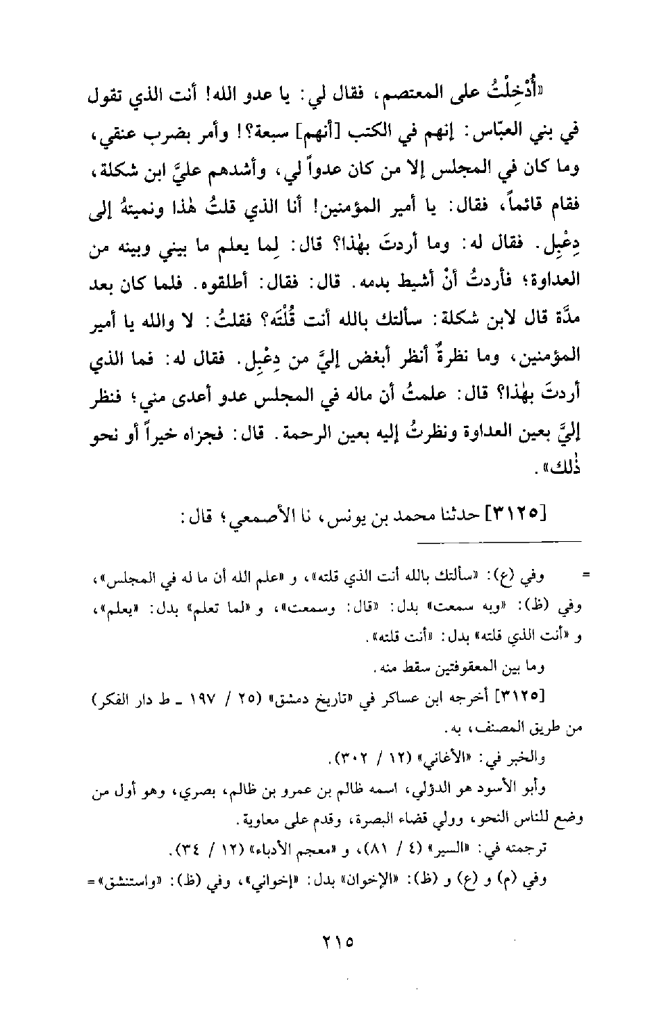 3125 - حَدَّثَنَا مُحَمَّدُ بْنُ يُونُسَ، نا الأَصْمَعِيُّ؛ قَالَ: -[216]- كَانَ أَبُو الأَسْوَدِ يُكْثِرُ الرُّكُوبَ، فَقِيلَ لَهُ: يَا أَبَا الأَسْوَدِ! لَوْ قَعَدْتَ فِي مَنْزِلِكَ كَانَ أَوْدَعَ لِبَدَنِكَ وَأَرْوَحَ. فَقَالَ أَبُو الأَسْوَدِ: صَدَقْتَ، وَلَكِنَّ الرُّكُوبَ أَتفَرِجُ فِيهِ وَأَسْتَمِعُ مِنَ الْخَيْرِ مَا لا أَسْمَعُهُ فِي مَنْزِلِي؛ فَأَسْتَنْشِقُ الرِّيحَ، فَتَرْجِعُ إِلَيَّ نَفْسِي، وَأُلاقِي إِخْوَانِي، وَلَوْ جَلَسْتُ فِي مَنْزِلِي؛ اغْتَمَّ بِي أَهْلِي، وَاسْتَأْنَسَ بِي الصَّبِيُّ، وَاجْتَرَأْتُ عَلَى الْخَادِمِ، وَكَلَّمَنِي مِنْ أَهْلِي مَنْ يَهَابُ أَنْ يُكَلِّمَنِي.