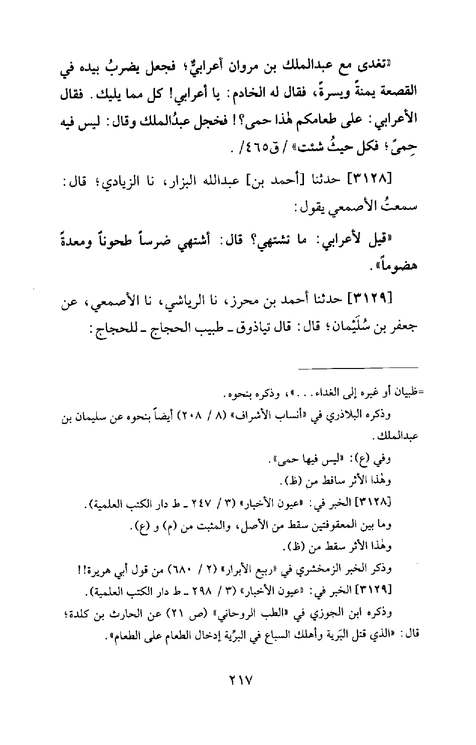 3129 - حَدَّثَنَا أَحْمَدُ بْنُ مُحْرِزٍ، نا الرِّيَاشِيُّ، نا الأَصْمَعِيُّ، عَنْ جَعْفَرِ بْنِ سُلَيْمَانَ؛ قَالَ: قَالَ تِيَاذُوقُ - طَبِيبُ الْحَجَّاجِ - لِلْحَجَّاجِ: -[218]- إِنَّ اللَّحْمَ عَلَى اللَّحْمِ يَقْتُلُ السِّبَاعَ فِي الْبَرِّيَّةِ؛ فَكَيْفَ بَنِي آدَمَ عَلَى الْفُرُشِ؟ !