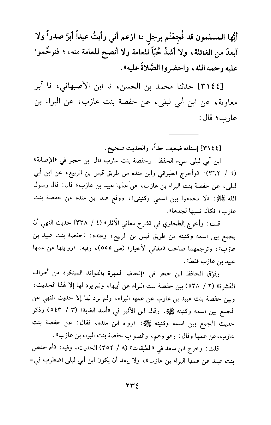 3144 - حَدَّثَنَا مُحَمَّدُ بْنُ الْحَسَنِ، نا ابْنُ الأَصْبَهَانِيِّ، نا أَبُو مُعَاوِيَةَ، عَنْ ابن أبي الدنيا، عَنْ حَفْصَةَ بِنْتِ عَازِبٍ، عَنِ الْبَرَاءِ بْنِ عَازِبٍ؛ قَالَ: -[235]- سَأَلَ رَجُلٌ النَّبِيَّ صَلَّى اللَّهُ عَلَيْهِ وَسَلَّمَ عَنْ مَوَاقِيتِ الصَّلاةِ، فَأَمَرَ بِلالا؛ فَقَدَّمَ وَأَخَّرَ. قَالَ: «مَا بَيْنَهُمَا وَقْتٌ»