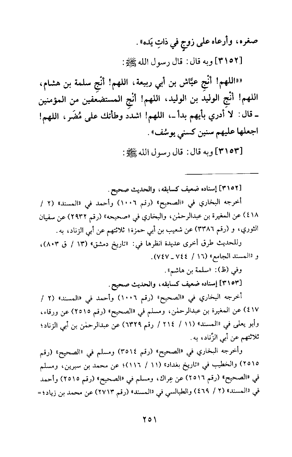3152 - وَبِهِ قَالَ: قَالَ رَسُولُ اللهِ صَلَّى اللَّهُ عَلَيْهِ وَسَلَّمَ: «اللهُمَّ! أَنْجِ عَيَّاشَ بْنَ أَبِي رَبِيعَةَ، اللهُمَّ! أَنْجِ سَلَمَةَ بْنَ هِشَامٍ، اللهُمَّ! أَنْجِ الْوَلِيدَ بْنَ الْوَلِيدِ، اللهُمَّ! أَنْجِ الْمُسْتَضْعَفِينَ مِنَ الْمُؤْمِنِينَ - قَالَ: لا أَدْرِي بِأَيِّهِمْ بَدَأَ -، اللهُمَّ! اشْدُدْ وَطْأَتَكَ عَلَى مُضَرَ، اللهُمَّ! اجْعَلْهَا عَلَيْهِمْ سَنِينَ كَسِنِي يُوسُفَ»