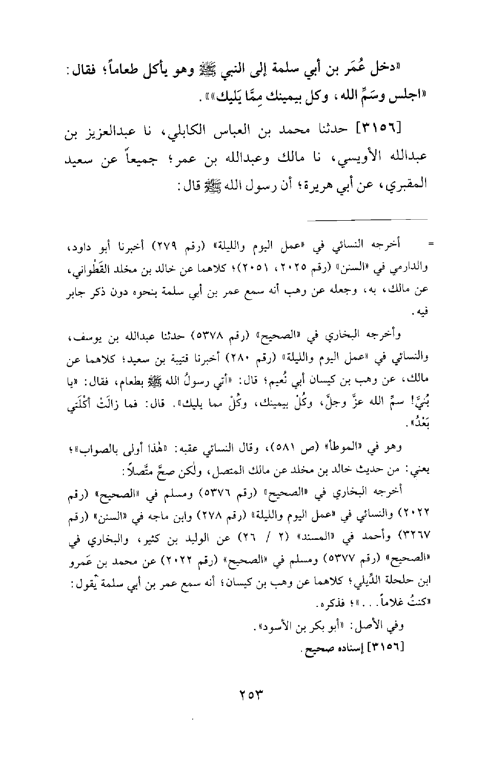 3156 - حَدَّثَنَا مُحَمَّدُ بْنُ الْعَبَّاسِ الْكَابُلِيُّ، نا عَبْدُ الْعَزِيزِ بْنُ عَبْدِ اللهِ الأُوَيْسِيُّ، نا مَالِكٌ وَعَبْدُ اللهِ بْنُ عُمَرَ؛ جَمِيعًا عَنْ سَعِيدٍ الْمَقْبُرِيِّ، عَنْ أَبِي هُرَيْرَةَ؛ أَنَّ رَسُولَ اللهِ صَلَّى اللَّهُ عَلَيْهِ وَسَلَّمَ قَالَ -[256]-: «إِذَا أَتَى أَحَدُكُمْ فِرَاشَهُ، فَلْيَنْفُضْهُ بِصَنْفَةِ ثَوْبِهِ؛ فَإِنَّهُ لا يَدْرِي مَا خَلَفَهُ عَلَيْهِ، وَلْيَقُلْ: بِاسْمِكَ رَبِّي وَضَعْتُ جَنْبِي وَبِكَ أَرْفَعُهُ، إِنْ أَمْسَكْتَ نَفْسِي فَاغْفِرْ لَهَا، وَإِنْ أَرْسَلْتَهَا فَاحْفَظْهَا بِمَا تَحْفَظُ بِهِ عِبَادَكَ الصَّالِحِينَ» . -[257]- وَمَالِكٌ لَمْ يَقُلْ فِي حَدِيثِهِ: «مَا خَلَفَهُ عَلَيْهِ»