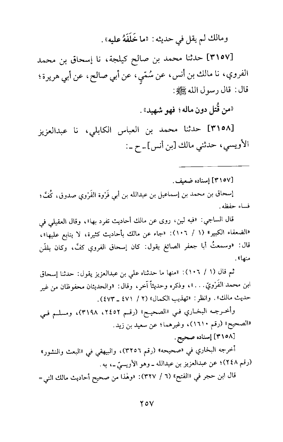 3157 - حَدَّثَنَا محمد بن صالح كَيْلَجَةَ، نا إِسْحَاقُ بْنُ مُحَمَّدٍ الْفَرَوِيِّ، نا مَالِكُ بْنُ أَنَسٍ، عَنْ سُمِيٍّ، عَنْ أَبِي صَالِحٍ، عَنْ أَبِي هُرَيْرَةَ؛ قَالَ: قَالَ رَسُولُ اللهِ صَلَّى اللَّهُ عَلَيْهِ وَسَلَّمَ: «مَنْ قُتِلَ دُونَ مَالِهِ؛ فَهُوَ شَهِيدٌ»