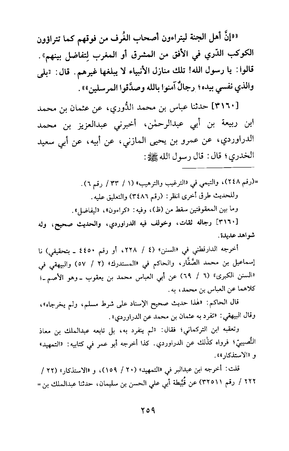 3160 - حَدَّثَنَا عَبَّاسُ بْنُ مُحَمَّدٍ الدُّورِيُّ، عَنْ عُثْمَانَ بْنِ مُحَمَّدِ بْنِ رَبِيعَةَ بْنِ أَبِي عَبْدِ الرَّحْمَنِ، أَخْبَرَنِي عَبْدُ الْعَزِيزِ بْنُ مُحَمَّدٍ الدَّرَاوَرْدِيُّ، عَنْ عَمْرِو بْنِ يَحْيَى الْمَازِنِيِّ، عَنْ أَبِيهِ، عَنْ أَبِي سَعِيدٍ الْخُدْرِيِّ؛ قَالَ: قَالَ رسول الله -[263]- صَلَّى اللَّهُ عَلَيْهِ وَسَلَّمَ: «لا ضرر وَلا ضِرَارَ، مَنْ ضَارَّ ضَرَّ اللهُ بِهِ، وَمَنْ شَاقَّ شَقَّ اللهُ عَلَيْهِ»
