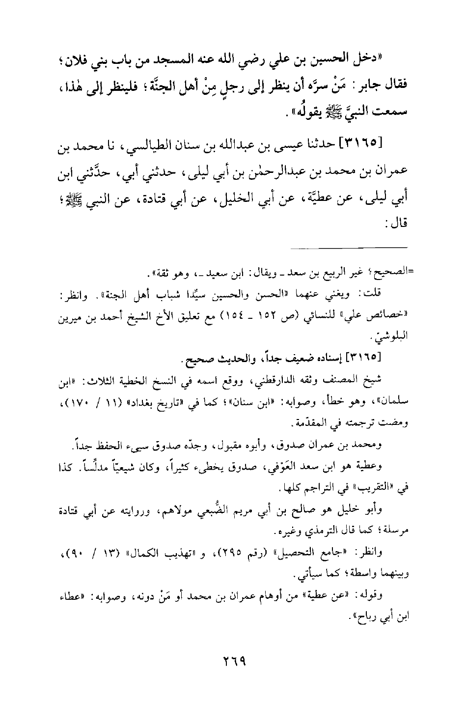 3165 - حَدَّثَنَا عِيسَى بْنُ عَبْدِ اللهِ بْنِ سِنَانٍ الطَّيَالِسِيُّ، نا مُحَمَّدُ بْنُ عِمْرَانَ بْنِ مُحَمَّدِ بْنِ عَبْدِ الرَّحْمَنِ بْنِ أَبِي لَيْلَى، حَدَّثَنِي أَبِي، حَدَّثَنِي ابْنُ أَبِي ليلى، عن عطية، عَنْ أَبِي الْخَلِيلِ، عَنْ أَبِي قَتَادَةَ، عَنِ النَّبِيِّ صَلَّى اللَّهُ عَلَيْهِ وَسَلَّمَ؛ قال -[271]-: «صَوْمُ عَاشُورَاءَ كَفَّارَةُ سَنَةٍ، وَصَوْمُ عَرَفَةَ كَفَّارَةُ سَنَتَيْنِ؛ ماضية ومستقبلة»