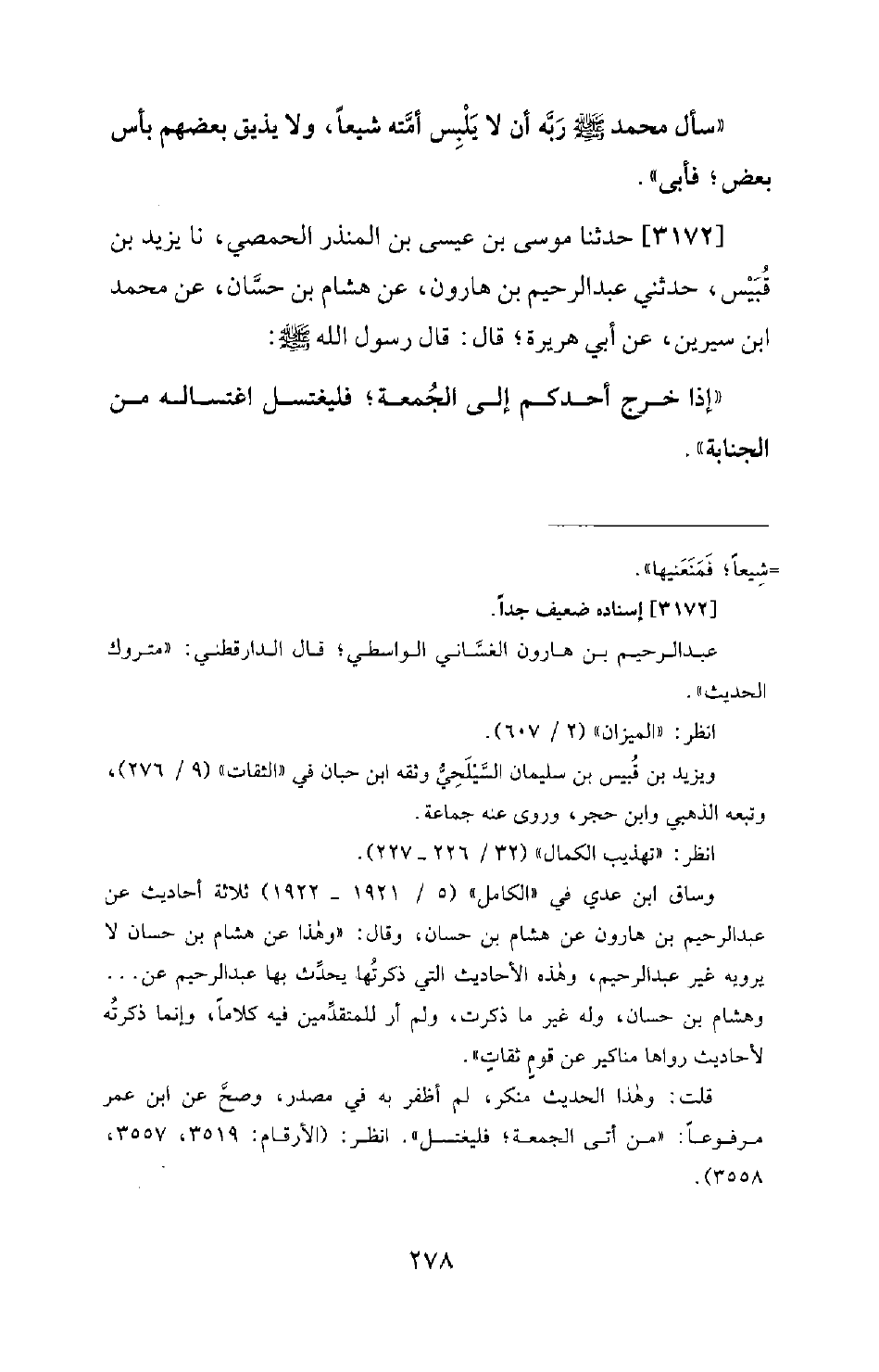 3172 - حَدَّثَنَا مُوسَى بْنُ عِيسَى بْنِ الْمُنْذِرِ الْحِمْصِيُّ، نا يَزِيدُ بْنُ قُبَيْسٍ، حَدَّثَنِي عَبْدُ الرَّحِيمِ بْنُ هَارُونَ، عَنْ هِشَامِ بْنِ حَسَّانٍ، عَنْ مُحَمَّدِ بْنِ سِيرِينَ، عَنْ أَبِي هُرَيْرَةَ؛ قَالَ: قَالَ رَسُولُ اللهِ صَلَّى اللَّهُ عَلَيْهِ وَسَلَّمَ: «إِذَا خَرَجَ أَحَدُكُمْ إِلَى الْجُمُعَةِ؛ فَلْيَغْتَسِلِ اغْتِسَالَهُ مِنَ الْجَنَابَةِ»
