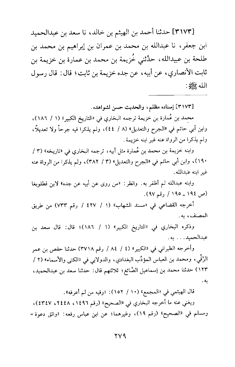 3173 - حَدَّثَنَا أَحْمَدُ بْنُ الْهَيْثَمِ بْنِ خَالِدٍ، نا سَعْدُ بْنُ عَبْدِ الْحَمِيدِ بْنِ جَعْفَرٍ، نا عَبْدُ اللهِ بْنُ مُحَمَّدِ بْنِ عِمْرَانَ بْنِ إِبْرَاهِيمَ بْنِ مُحَمَّدِ بْنِ طَلْحَةَ بْنِ عُبَيْدِ اللهِ، حَدَّثَنِي خُزَيْمَةُ بْنُ مُحَمَّدِ بْنِ عُمَارَةَ بْنِ خُزَيْمَةَ بْنِ ثَابِتٍ الأَنْصَارِيُّ، عَنْ أَبِيهِ، عَنْ جَدِّهِ خُزَيْمَةَ بْنِ ثَابِتٍ؛ قَالَ: قَالَ رَسُولُ اللهِ -[280]- صَلَّى اللَّهُ عَلَيْهِ وَسَلَّمَ: «اتَّقُوا دَعْوَةَ الْمَظْلُومِ؛ فَإِنَّهَا تُحْمَلُ عَلَى الْغَمَامِ، يَقُولُ اللهُ عَزَّ وَجَلَّ: وَعِزَّتِي وَجَلالِي؛ لأَنْصُرَنَّكِ وَلَوْ بَعْدَ حِينٍ»