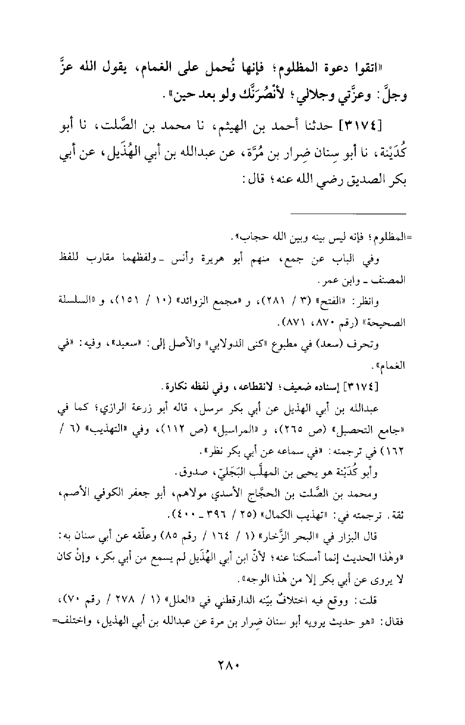 3174 - حَدَّثَنَا أَحْمَدُ بْنُ الْهَيْثَمِ، نا مُحَمَّدُ بْنُ الصَّلْتِ، نا أَبُو كُدَيْنَةَ، نا أَبُو سِنَانٍ ضِرَارُ بْنُ مُرَّةَ، عَنْ عَبْدِ اللهِ بْنِ أَبِي الْهُذَيْلِ، عَنْ أَبِي بَكْرٍ الصِّدِّيقِ رَضِيَ اللهُ عَنْهُ؛ قَالَ: -[281]- سَأَلْتُ رَسُولَ اللهِ صَلَّى اللَّهُ عَلَيْهِ وَسَلَّمَ عَنِ الإِزَارِ، فَأَخَذَ بِوَسَطِ الْعَضَلَةِ. قُلْتُ: زِدْنَا يَا رَسُولَ اللهِ! قَالَ: «لا خَيْرَ فِي أَسْفَلَ مِنْ ذَلِكَ» . قُلْنَا: هَلَكْنَا يَا -[282]- رَسُولَ اللهِ!