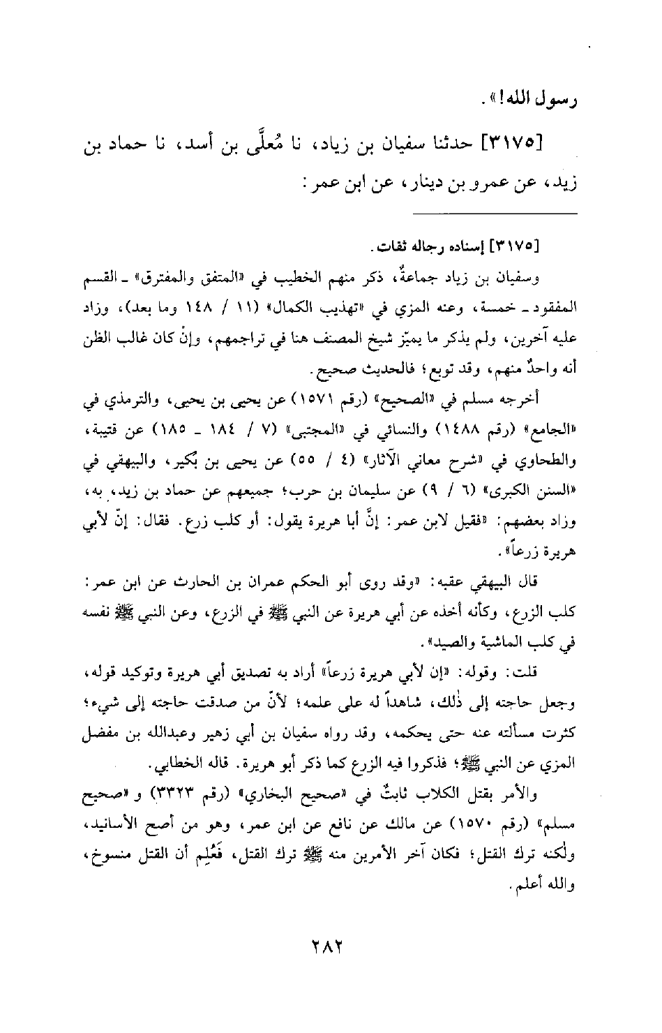 3175 - حَدَّثَنَا سُفْيَانُ بْنُ زِيَادٍ، نا مُعَلَّى بْنُ أَسَدٍ، نا حَمَّادُ بْنُ زَيْدٍ، عَنْ عَمْرِو بْنِ دِينَارٍ، عَنِ ابْنِ عُمَرَ: -[283]- أَنَّ رَسُولَ اللهِ صَلَّى اللَّهُ عَلَيْهِ وَسَلَّمَ أَمَرَ بِقَتْلِ الْكِلابِ؛ إِلا كَلْبَ مَاشِيَةٍ أَوْ صَيْدٍ