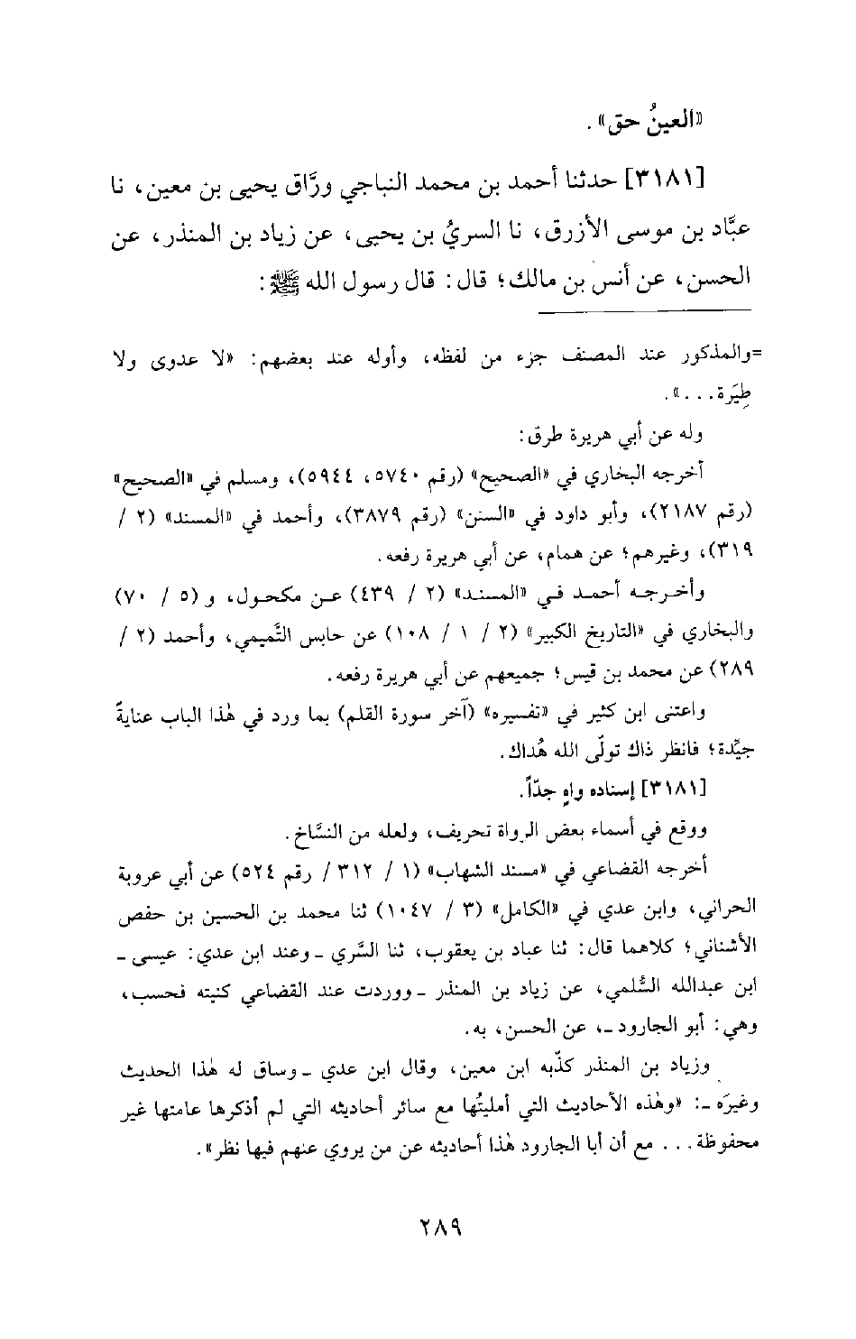 3181 - حَدَّثَنَا أَحْمَدُ بْنُ مُحَمَّدٍ النِّبَاجِيُّ وَرَّاقُ يَحْيَى بْنِ مَعِينٍ، نا عَبَّادُ بْنُ مُوسَى الأَزْرَقُ، نا السَّرِيُّ بْنُ يَحْيَى، عَنْ زِيَادِ بْنِ الْمُنْذِرِ، عَنِ الْحَسَنِ، عَنْ أَنَسِ بْنِ مَالِكٍ؛ قَالَ: قَالَ رَسُولُ اللهِ -[292]- صَلَّى اللَّهُ عَلَيْهِ وَسَلَّمَ: «مَنْ قَتَلَ عُصْفُورًا عَبَثًا؛ جَاءَ يَوْمَ الْقِيَامَةِ وَلَهُ صُرَاخٌ: رَبِّ! سَلْ هَذَا لِمَ قَتَلَنِي عَبَثًا بِلا مَنْفَعَةٍ»