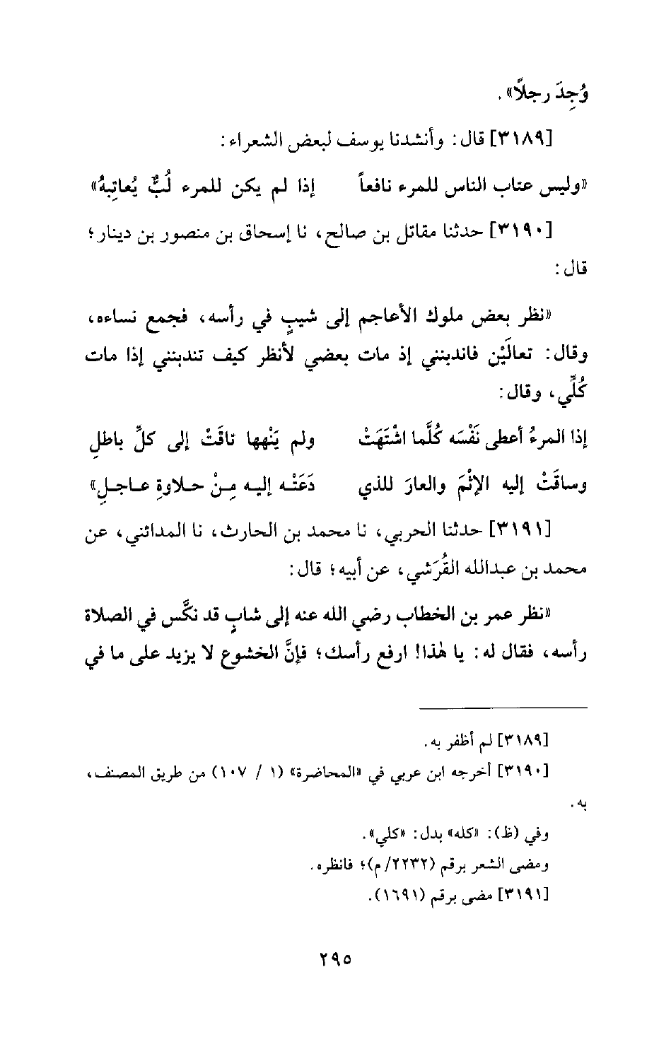 3191 - حَدَّثَنَا الْحَرْبِيُّ، نا مُحَمَّدُ بْنُ الْحَارِثِ، نا الْمَدَائِنِيُّ، عَنْ مُحَمَّدِ بْنِ عَبْدِ اللهِ الْقُرَشِيِّ، عَنْ أَبِيهِ؛ قَالَ: نَظَرَ عُمَرُ بْنُ الْخَطَّابِ رَضِيَ اللهُ عَنْهُ إِلَى شَابٍّ قَدْ نَكَّسَ فِي الصَّلاةِ رَأْسَهُ، فَقَالَ لَهُ: يَا هَذَا! ارْفَعْ رَأْسَكَ؛ فَإِنَّ الْخُشُوعَ لا يَزِيدُ عَلَى مَا فِي -[296]- الْقَلْبِ، فَمَنْ أَظْهَرَ لِلنَّاسِ خُشُوعًا فَوْقَ مَا فِي قَلْبِهِ؛ فَإِنَّمَا أَظْهَرَ نِفَاقًا عَلَى نِفَاقٍ.