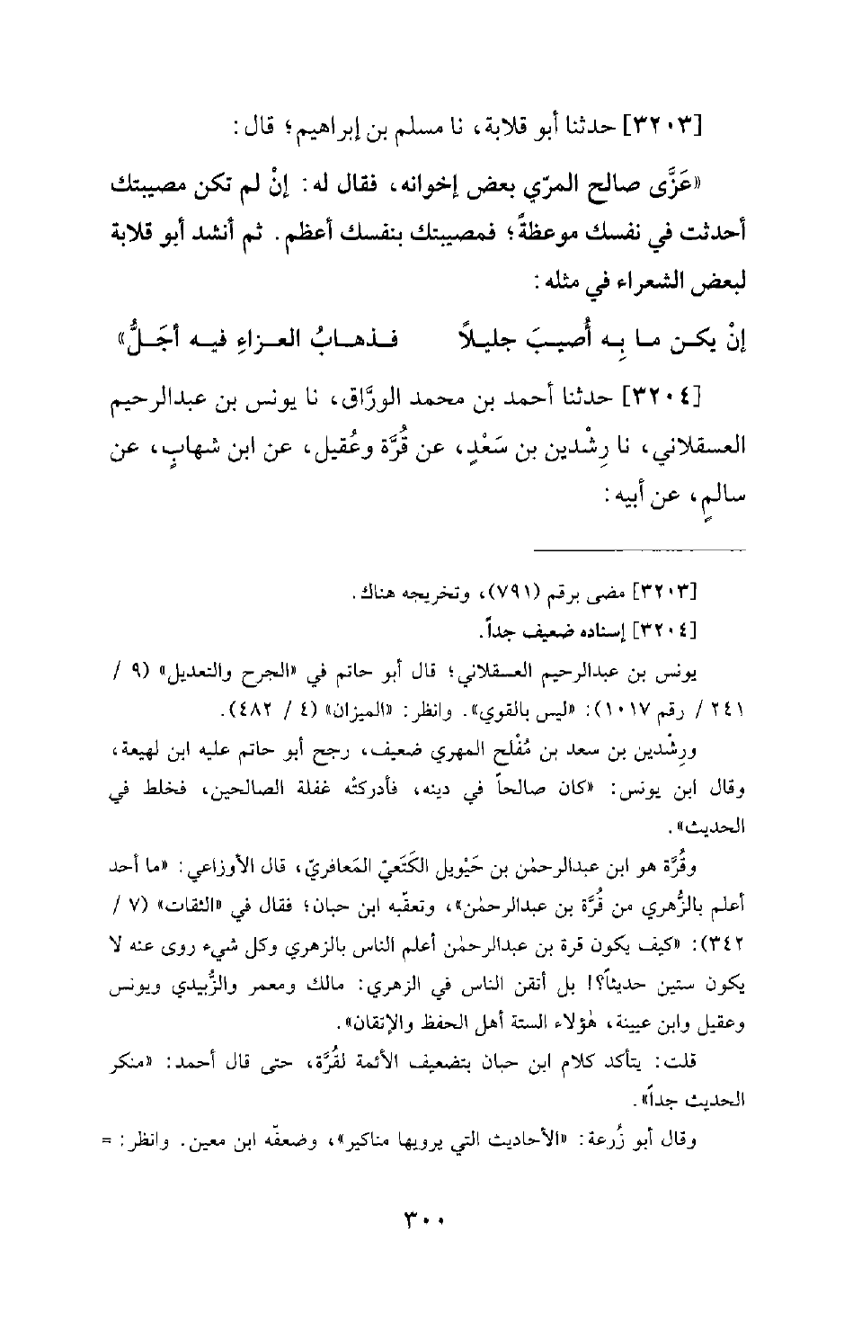 3203 - حَدَّثَنَا أَبُو قِلابَةَ، نا مُسْلِمُ بْنُ إِبْرَاهِيمَ؛ قَالَ: عَزَّى صَالِحٌ الْمُرِّيُّ بَعْضَ إِخْوَانِهِ، فَقَالَ لَهُ: إِنْ لَمْ تَكُنْ مُصِيبَتُكَ أَحْدَثَتْ فِي نَفْسِكَ مَوْعِظَةً؛ فَمُصِيبَتُكَ بِنَفْسِكَ أَعْظَمُ. ثُمَّ أَنْشَدَ أَبُو قِلابَةَ لِبَعْضِ الشُّعَرَاءِ فِي مِثْلِهِ: