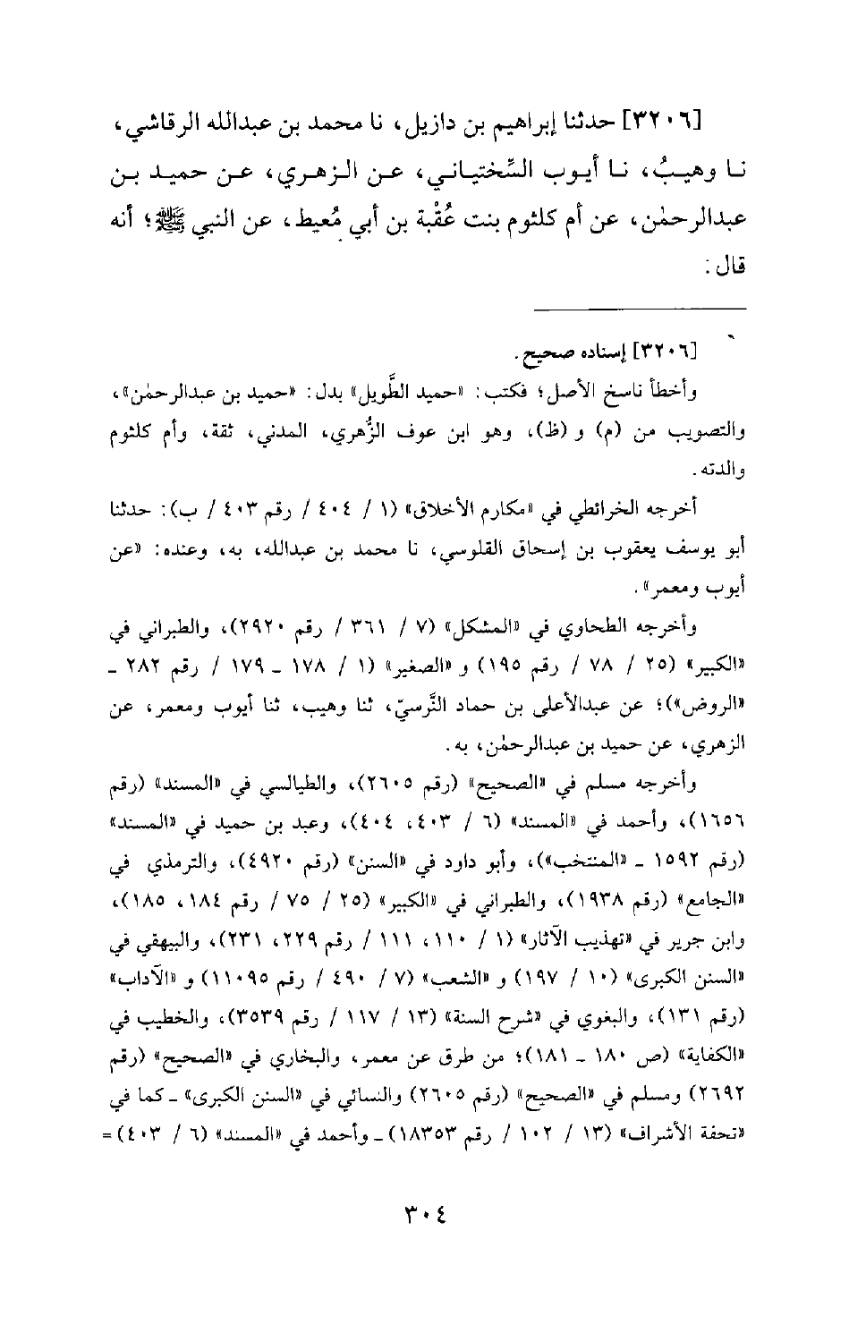3206 - حَدَّثَنَا إِبْرَاهِيمُ بْنُ دَازِيلَ، نا مُحَمَّدُ بْنُ عَبْدِ اللهِ الرَّقَاشِيُّ؛ نا وُهَيْبٌ، نا أَيُّوبُ السَّخْتِيَانِيُّ، عَنِ الزُّهْرِيِّ، عَنْ حُمَيْدِ بْنِ عَبْدِ الرَّحْمَنِ، عَنْ أُمِّ كُلْثُومٍ بِنْتِ عُقْبَةَ بْنِ أَبِي مُعَيْطٍ، عَنِ النَّبِيِّ صَلَّى اللَّهُ عَلَيْهِ وَسَلَّمَ؛ أَنَّهُ قَالَ -[306]-: «لَيْسَ الْكَذَّابُ مَنْ أَصْلَحَ بَيْنَ النَّاسِ فَقَالَ خَيْرًا أَوْ نَمَّى خَيْرًا»